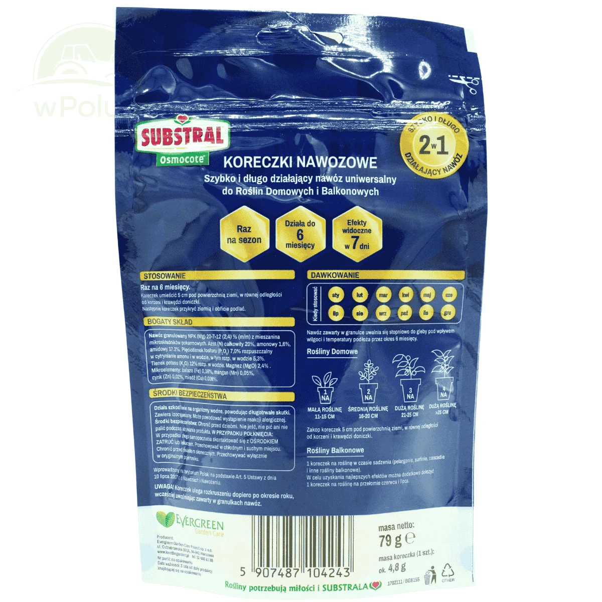 Osmocote 2 w 1 Koreczki Nawozowe Uniwersalne Substral to nowoczesny nawóz przeznaczony do nawożenia kwiatów balkonowych oraz roślin domowych uprawianych na zewnątrz. Produkt ma postać praktycznych koreczków nawozowych, które łączą szybkie działanie z długotrwałym uwalnianiem składników pokarmowych. Ulepszona formuła nowej generacji oparta jest na połączeniu granulek niepowlekanych, zapewniających natychmiastowe odżywienie roślin, oraz granulek powlekanych organiczną żywicą, które stopniowo uwalniają składniki przez dłuższy czas. Pierwsze efekty stosowania widoczne są już w ciągu 7 dni, a pełne działanie nawozu utrzymuje się nawet do 6 miesięcy. Forma koreczków minimalizuje ryzyko przenawożenia oraz chroni system korzeniowy przed uszkodzeniem.