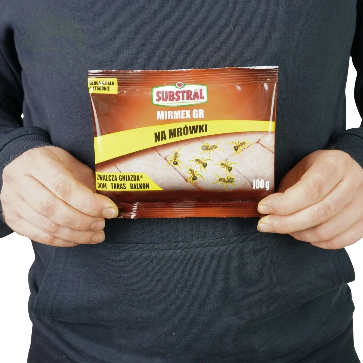 Substral Mirmex GR 100 g to gotowy do użycia środek owadobójczy w formie granulatu przeznaczony do zwalczania mrówek faraona i mrówek ognistek w domach, na balkonach, tarasach oraz wokół budynków. Produkt zawiera cypermetrynę – substancję czynną o działaniu kontaktowym i żołądkowym, która skutecznie eliminuje całe kolonie poprzez likwidację gniazda. Specjalna, atrakcyjna dla owadów formuła powoduje, że mrówki pobierają granulat i przenoszą go do mrowiska, co gwarantuje długofalowe działanie sięgające nawet 4 tygodni.