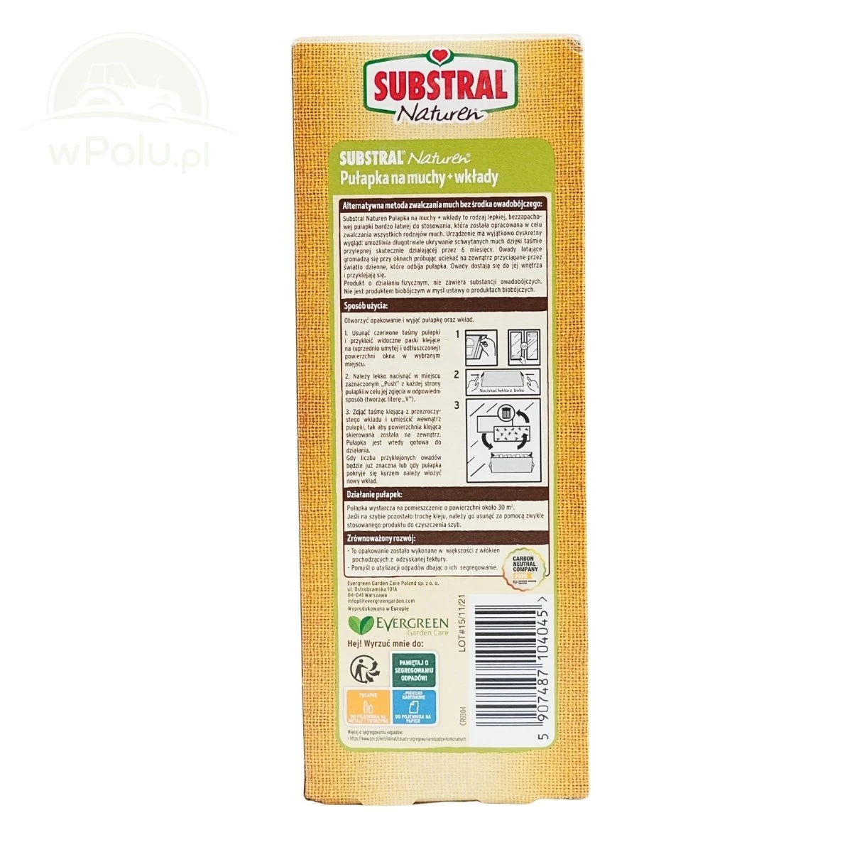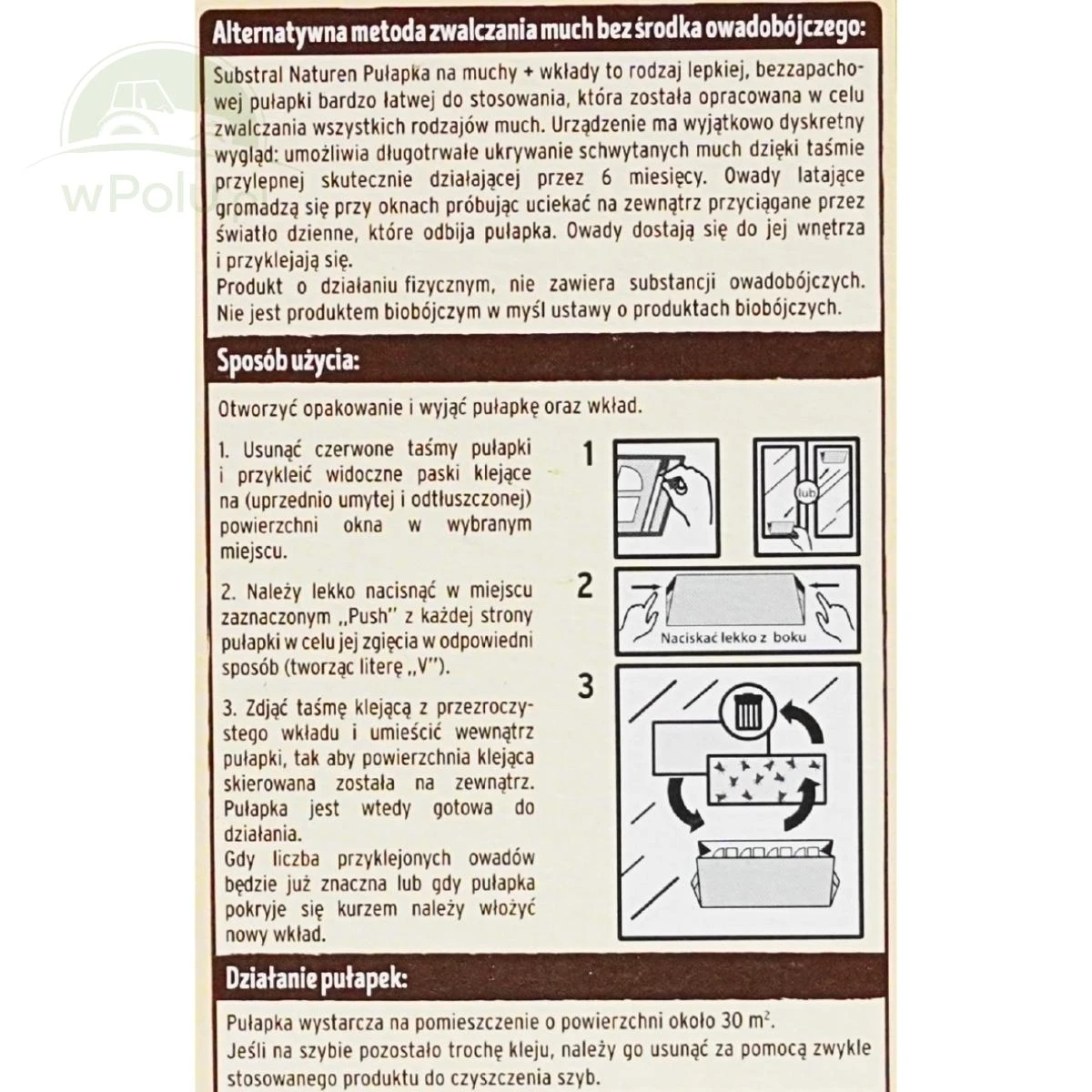 Pułapka sprawdza się szczególnie w miejscach, gdzie owady gromadzą sięprzy oknach, próbując wydostać się na zewnątrz. Konstrukcja w kształcie litery „V” odbija światło, przyciągając muchy do wnętrza, gdzie owady przyklejają się do lepowej powierzchni. Produkt jest łatwy w montażu – wystarczy odkleić taśmę mocującą, przykleić pułapkę do szyby, umieścić lepowy wkład i delikatnie zagiąć obudowę. Jeden zestaw wystarcza do pomieszczenia o powierzchni ok. 30 m². Wymiana wkładu jest szybka i higieniczna, a usunięcie ewentualnych pozostałości kleju z szyby nie stanowi problemu dzięki standardowym preparatom do czyszczenia.