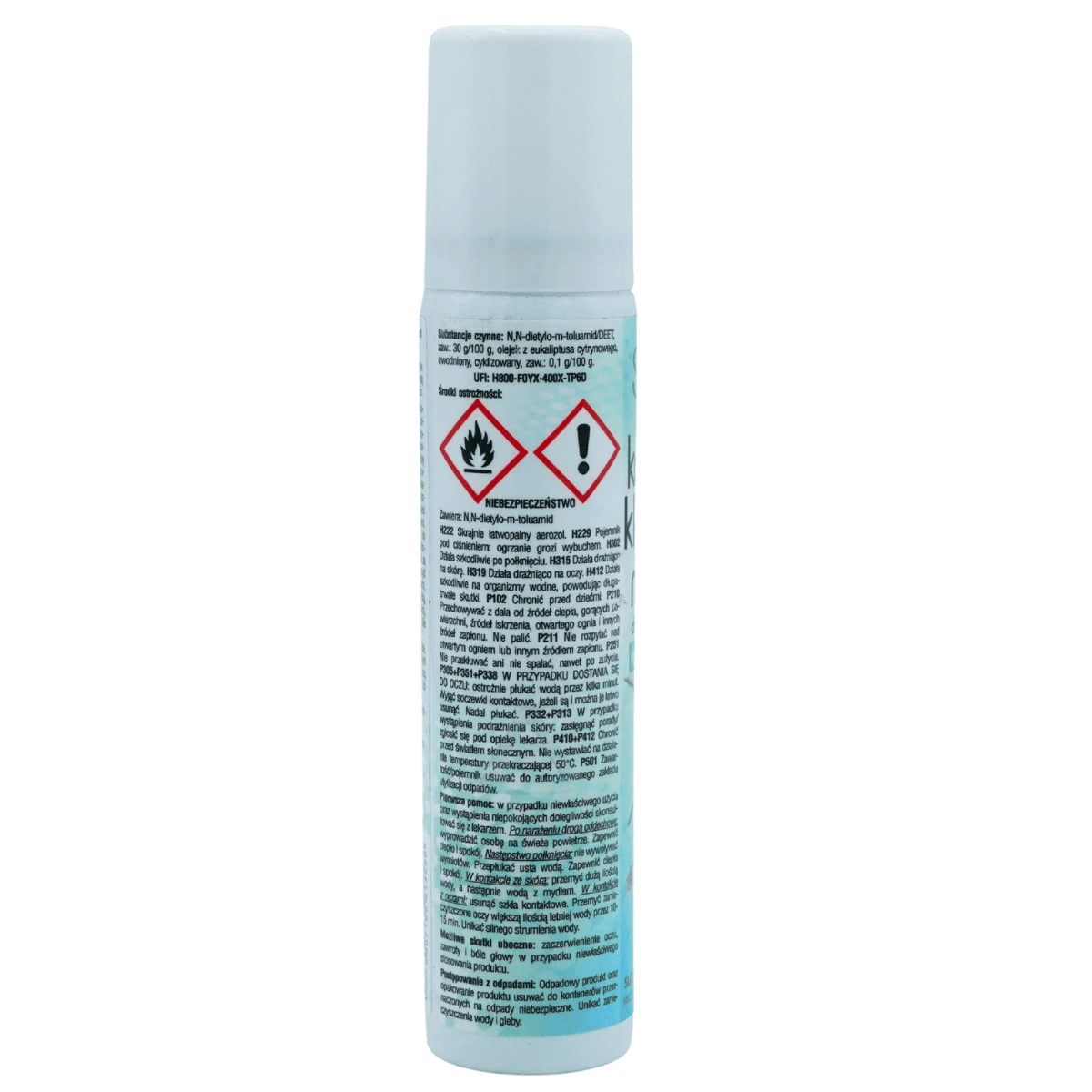 Preparat w postaci aerozolu, skutecznie odstraszający komary, meszki i kleszcze od osiadania na narażonych na ukąszenie częściach ciała.