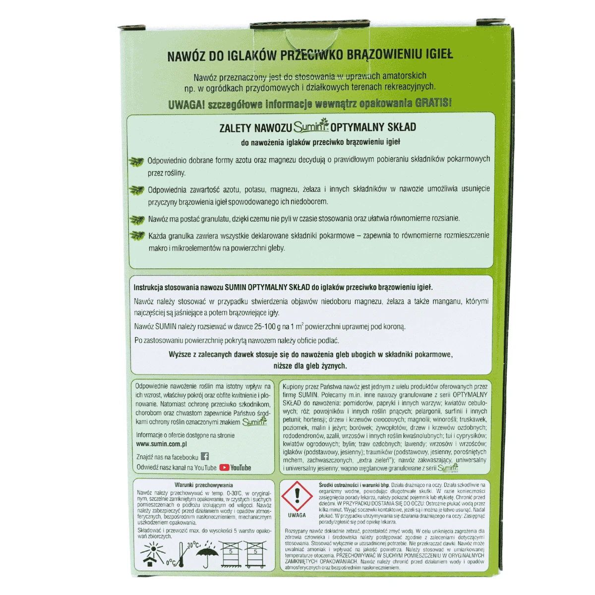 Granulowany nawóz do nawożenia wszystkich iglaków. Prawidłowe i rozłożone w czasie działanie nawozu, a także skuteczne pobieranie składników pokarmowych przez rośliny, jest możliwe dzięki specjalnej formie azotu oraz szybko przyswajalnemu magnezowi. Dzięki wysokiej zawartości magnezu ogranicza brązowienie igieł. Pomaga uzyskać intensywnie zieloną barwę roślin oraz podnosi ich zdrowotność. Wszystkie granulki zawierają deklarowane składniki pokarmowe, dzięki czemu składniki te są równomiernie rozmieszczane na powierzchni gleby.