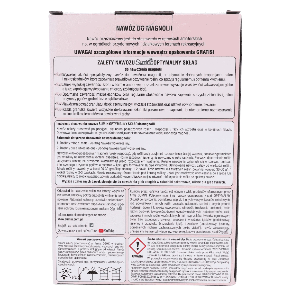 Wysokiej jakości nawóz do nawożenia magnolii, o optymalnie dobranych proporcjach makro i mikroskładników, które zapewniają prawidłowe odżywienie roślin, co sprzyja regularnemu i obfitemu kwitnieniu. Dzięki wysokiej zawartości azotu w formie amonowej oraz żelaza nawóz wykazuje właściwości zakwaszające glebę a także zapobiega występowaniu chlorozy (żółknięciu liści).