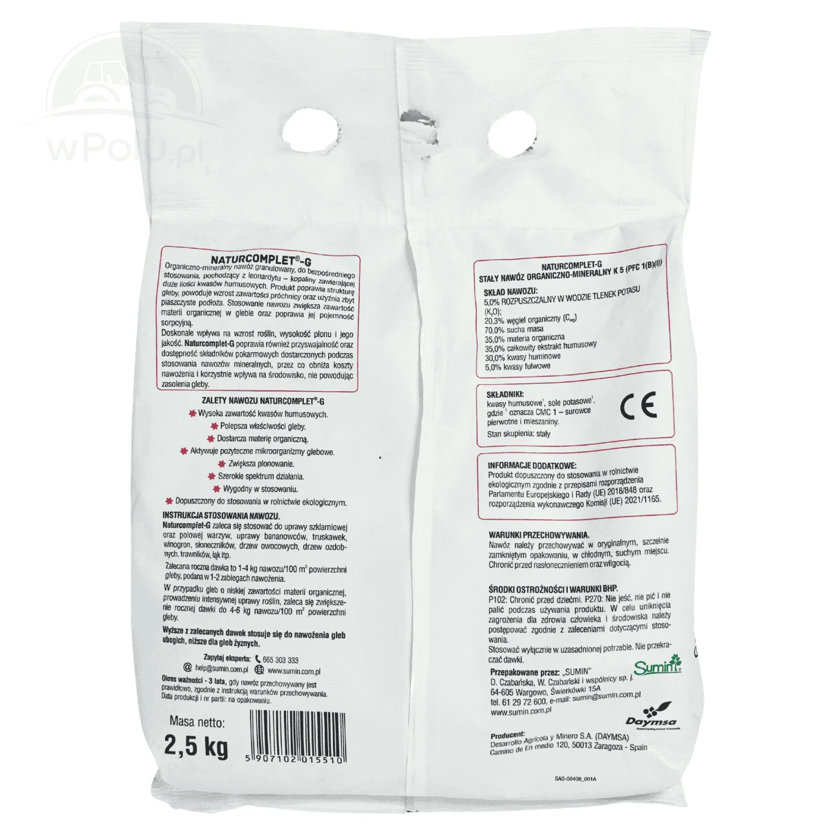 Naturcomplet-G jest dostępny w opakowaniach o wadze 5 kg. Oznacza to, że jedno opakowanie wystarcza na 80–500 m², w zależności od wybranej dawki.