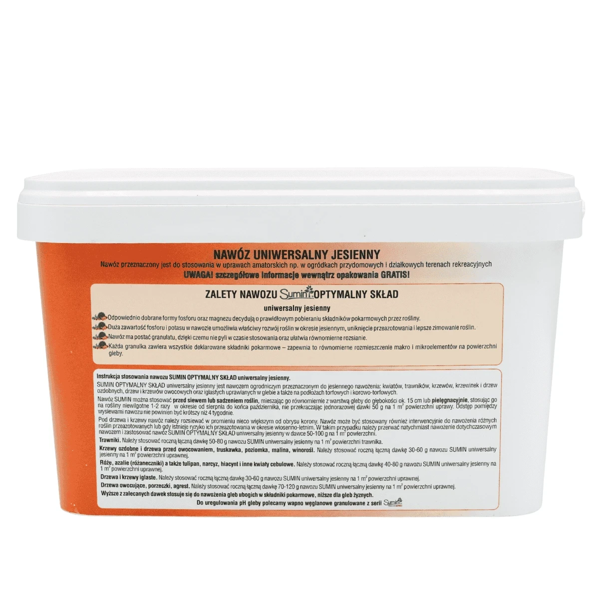 Nawóz uniwersalny jesienny Sumin to niezastąpiony preparat w okresie jesiennym. Wzmacnia rośliny, poprawia ich odporność na trudne warunki zimowe i zapewnia im zdrowy, energiczny start na wiosnę. Idealny wybór dla każdego, kto chce zabezpieczyć ogród przed zimą i zadbać o jego kondycję przez cały rok.