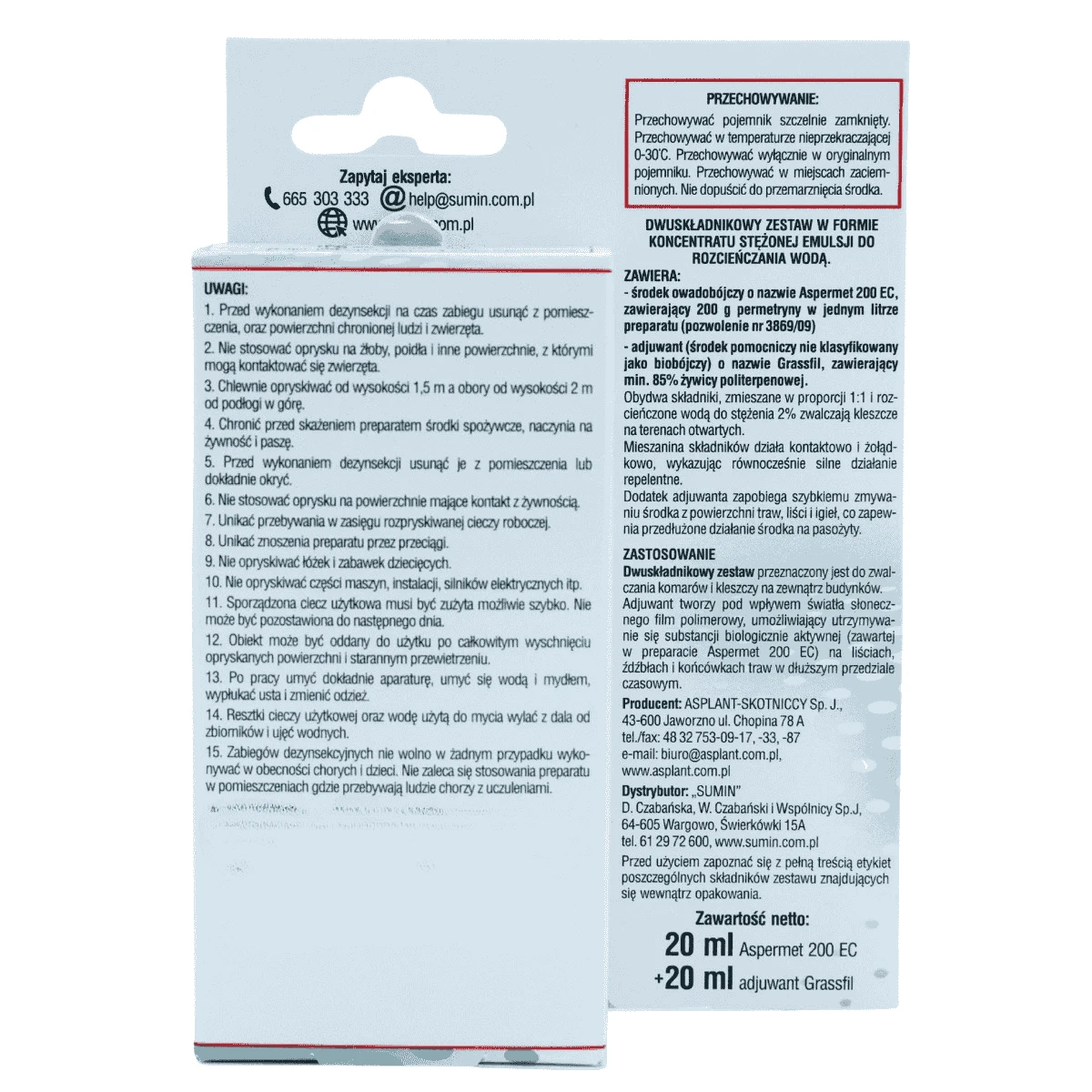 Dwuskładnikowy zestaw w formie koncentratu stężonej emulsji do rozcieńczania z wodą przeznaczony jest do zwalczania komarów i kleszczy na zewnątrz budynków .
