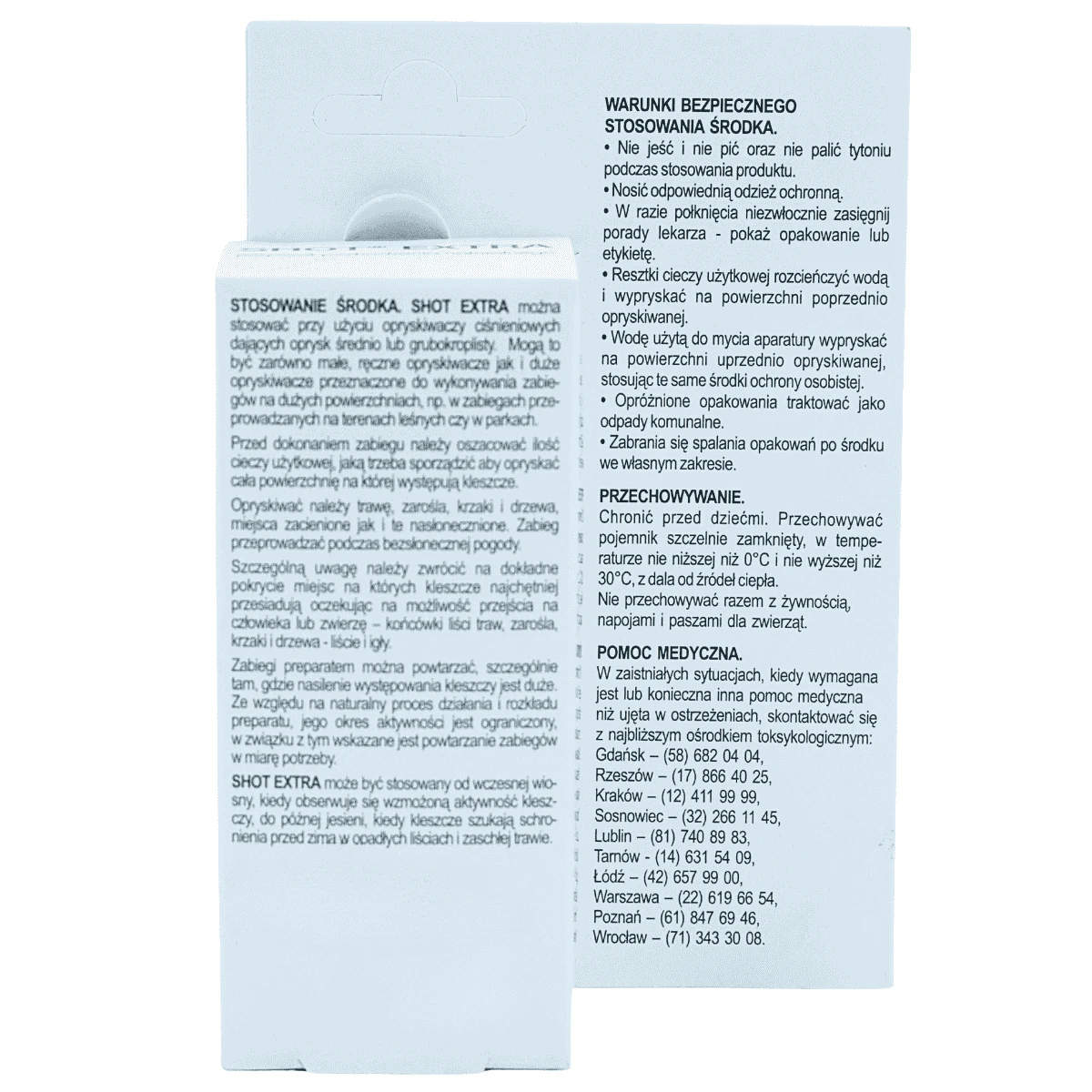 Naturalny preparat o działaniu mechanicznym przeznaczony do zwalczania kleszczy na otwartych terenach zielonych, np.: działkach, ogrodach przydomo-wych, placach zabaw, parkach, lasach lub w innych miejscach, w których kleszcze stanowią zagrożenie dla ludzi i zwierząt. Środek jest doskonałą alternatywą w miejscach, gdzie stosowanie konwencjonalnych środków chemicznych, zawie-rających chemiczne substancje aktywne, jest ograniczone bądź wręcz niemożliwe. Shot Extra można stosować przy użyciu opryskiwaczy ciśnieniowych dających oprysk średnio lub grubokroplisty. Mogą to być zarówno małe, ręczne opryskiwa-cze jak i duże opryskiwacze przeznaczone do wykonywania zabiegów na dużych powierzchniach, np. w zabiegach przeprowadzanych na terenach leśnych czy w parkach.