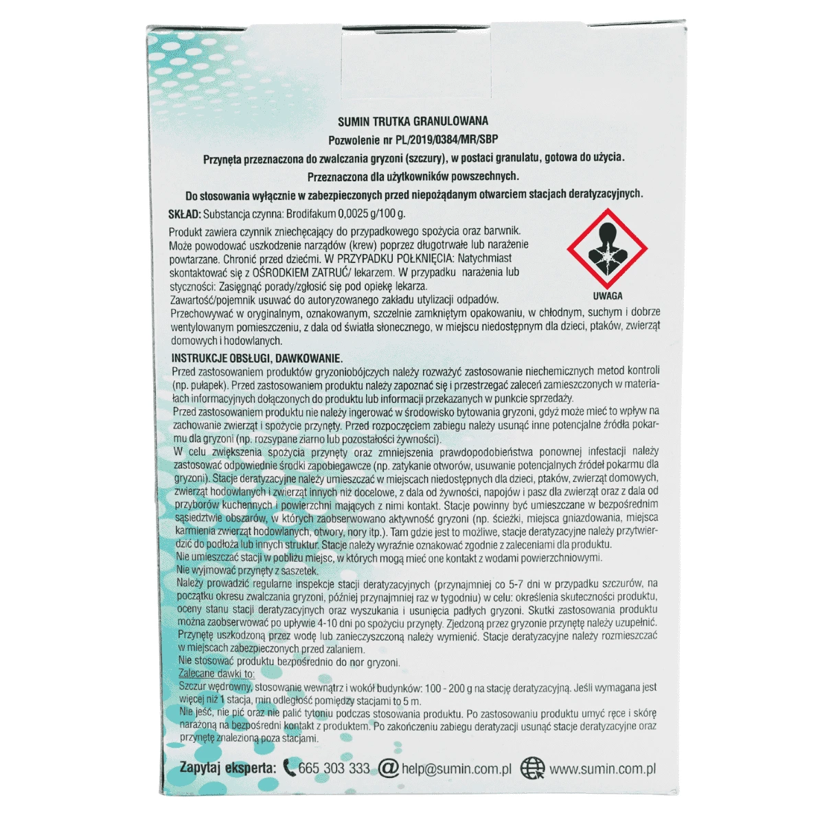 Sumin trutka granulowana 25 ppm to gotowa do użycia przynęta w postaci granulatu przeznaczona do zwalczania myszy i szczurów. Trutkę należy stosować wyłącznie w stacji deratyzacyjnej zabezpieczonej przed niepożądanym otwarciem. W skład produktu wchodzi czynnik zniechęcający do przypadkowego spożycia.