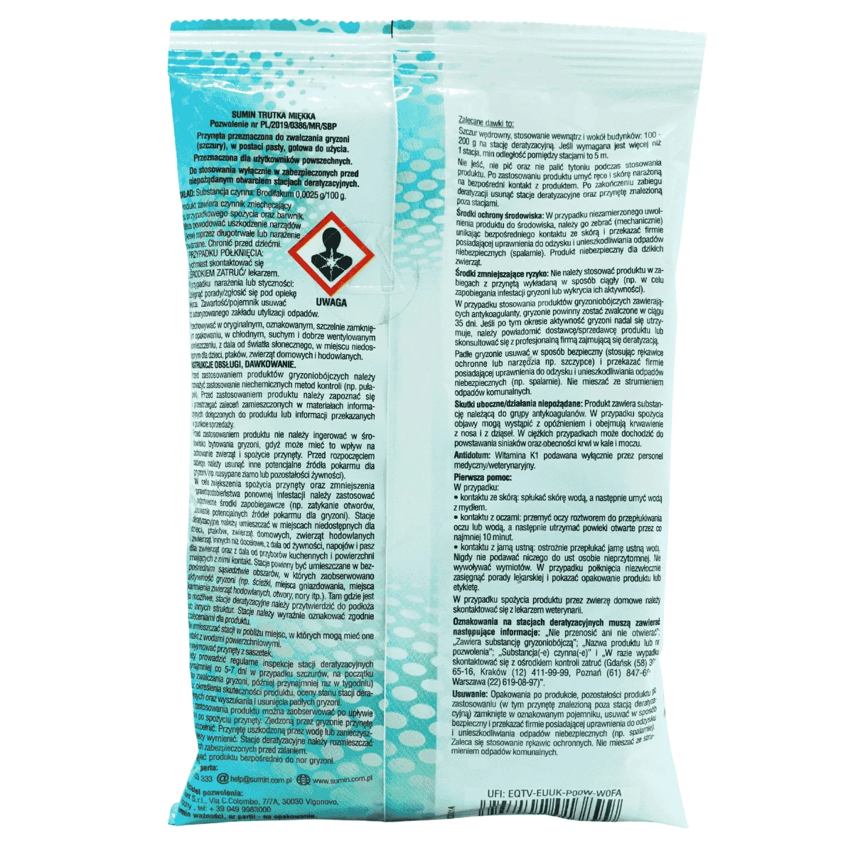 Trutka miękka (pasta) 25 ppm to profesjonalna, gotowa do użycia przynęta w formie wilgotnej pasty barwy niebieskiej, konfekcjonowana w wygodnych saszetkach. Preparat zawiera brodifakum 0,0025 g/100 g (25 ppm) – antykoagulant drugiej generacji, który eliminuje myszy domowe i szczury wędrowne już po jednorazowym spożyciu. Intensywny aromat zbóż i mleka zwiększa atrakcyjność przynęty, a odporna na wilgoć struktura pozwala utrzymać skuteczność nawet w trudnych warunkach środowiskowych.