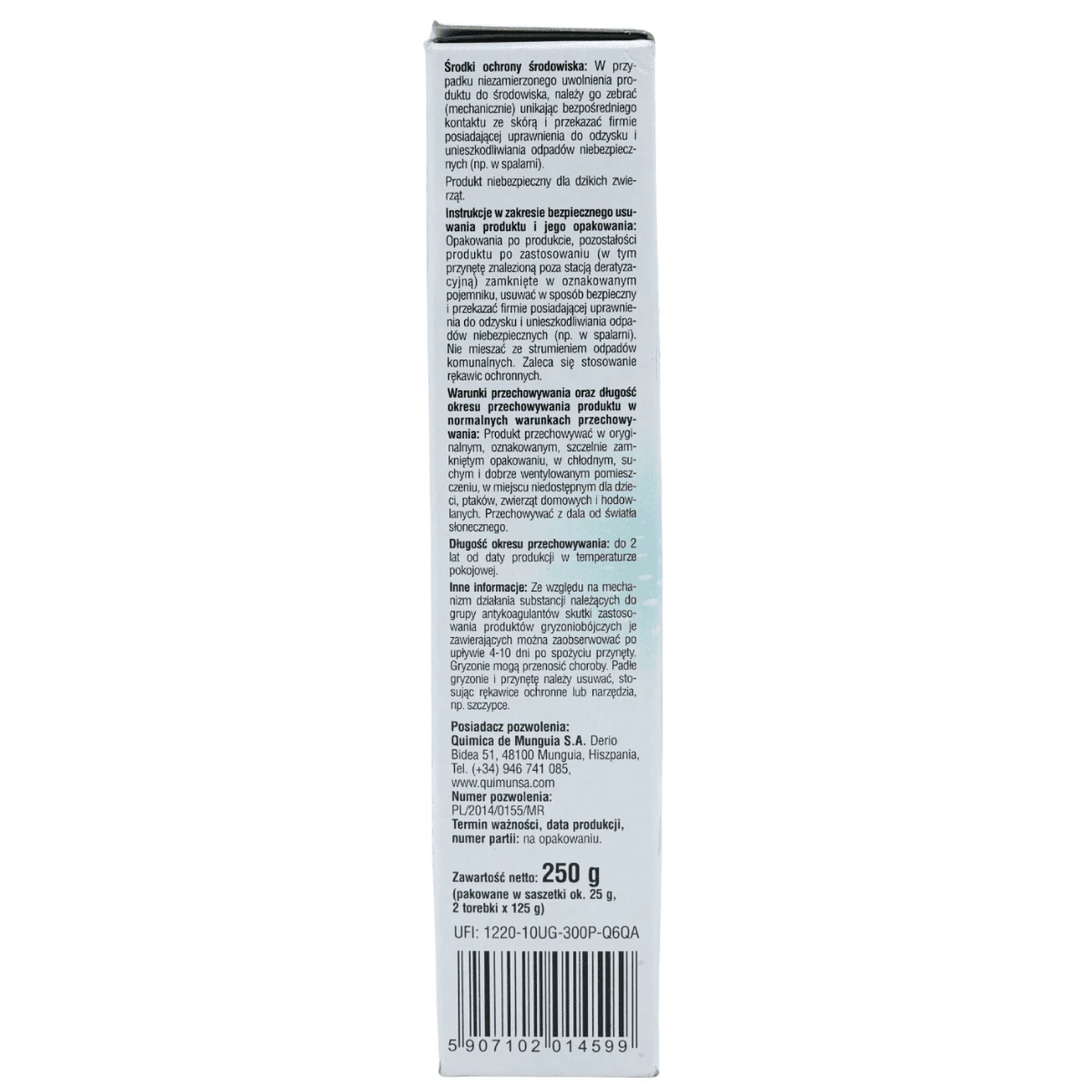 Preparat przeznaczony jest do stosowania wyłącznie w zabezpieczonych stacjach deratyzacyjnych – wewnątrz budynków gospodarczych, mieszkalnych oraz w ich bezpośrednim otoczeniu. W przypadku myszy zaleca się 60 g (2-3 saszetki) na stację, przy rozstawie co 10 m (5 m przy silnej infestacji). Dla szczurów stosować 100 g (4 saszetki) na stację, zachowując analogiczne odstępy. Regularne inspekcje (co 2-3 dni dla myszy, co 5-7 dni dla szczurów) oraz uzupełnianie zjedzonych porcji podnoszą skuteczność działania, a gorzki środek zapobiega przypadkowemu spożyciu przez dzieci lub zwierzęta niebędące celem deratyzacji.