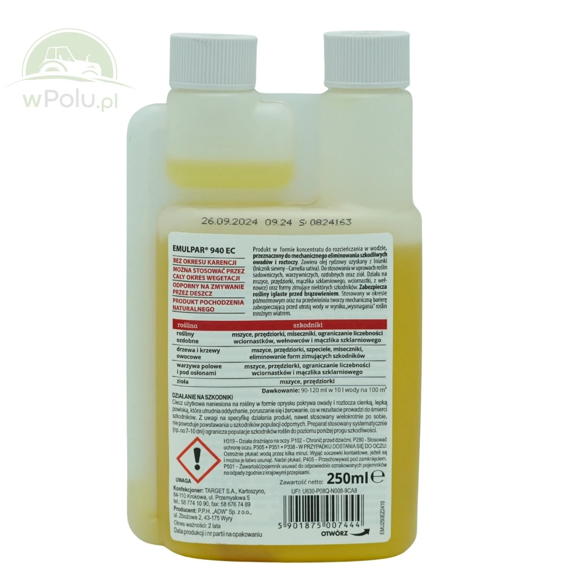 Emulpar 940 EC to innowacyjny preparat, który został stworzony z myślą o zwalczaniu szkodliwych owadów i roztoczy, takich jak mszyce, przędziorki, miseczniki, mączliki, wciornastki, miodówki, czerwce oraz formy zimujące niektórych szkodników. Produkt ten idealnie nadaje się do ochrony roślin ozdobnych, warzywnych oraz owocowych, uprawianych zarówno w domu, na balkonie, jak i w ogrodzie. Skutecznie zabezpiecza rośliny iglaste przed brązowieniem. Stosowany późną zimą oraz w okresie przedwiośnia tworzy mechaniczną barierę, która chroni rośliny przed utratą wody na skutek działania mroźnego wiatru. Preparat można stosować zarówno w celach interwencyjnych, jak i zapobiegawczych. Produkt ten można stosować przez cały okres wegetacji roślin.