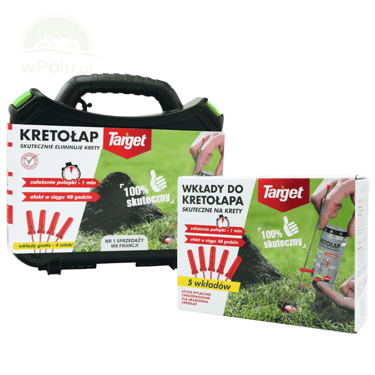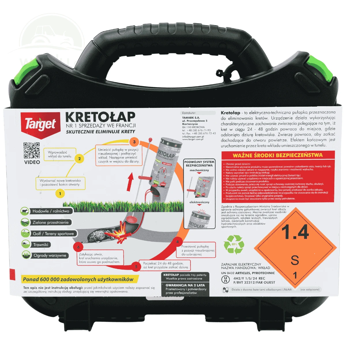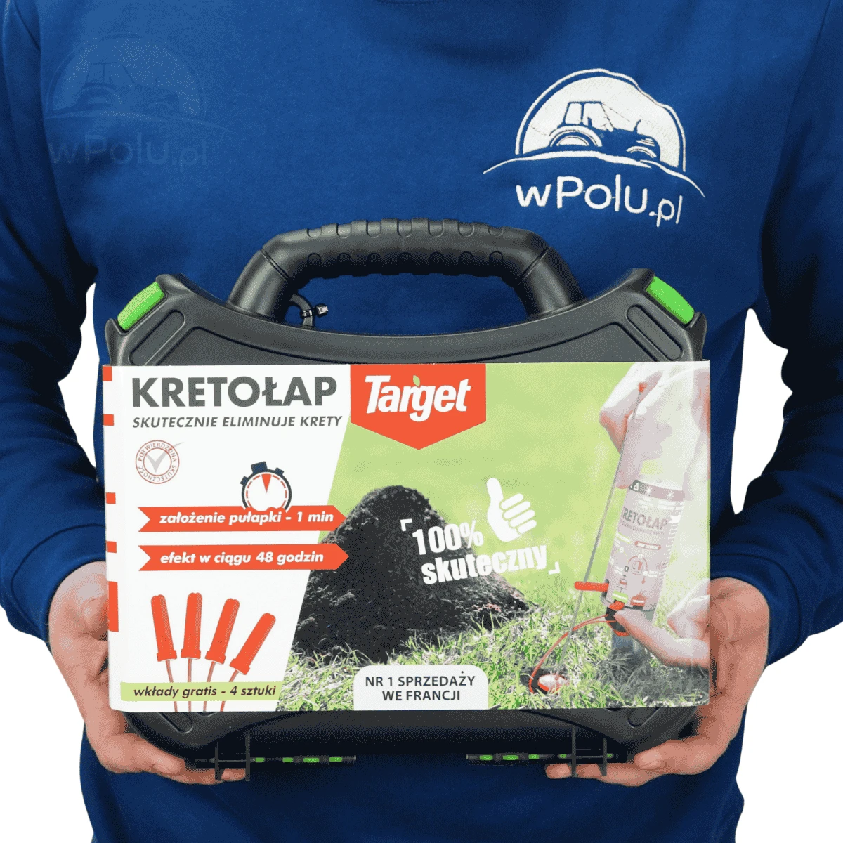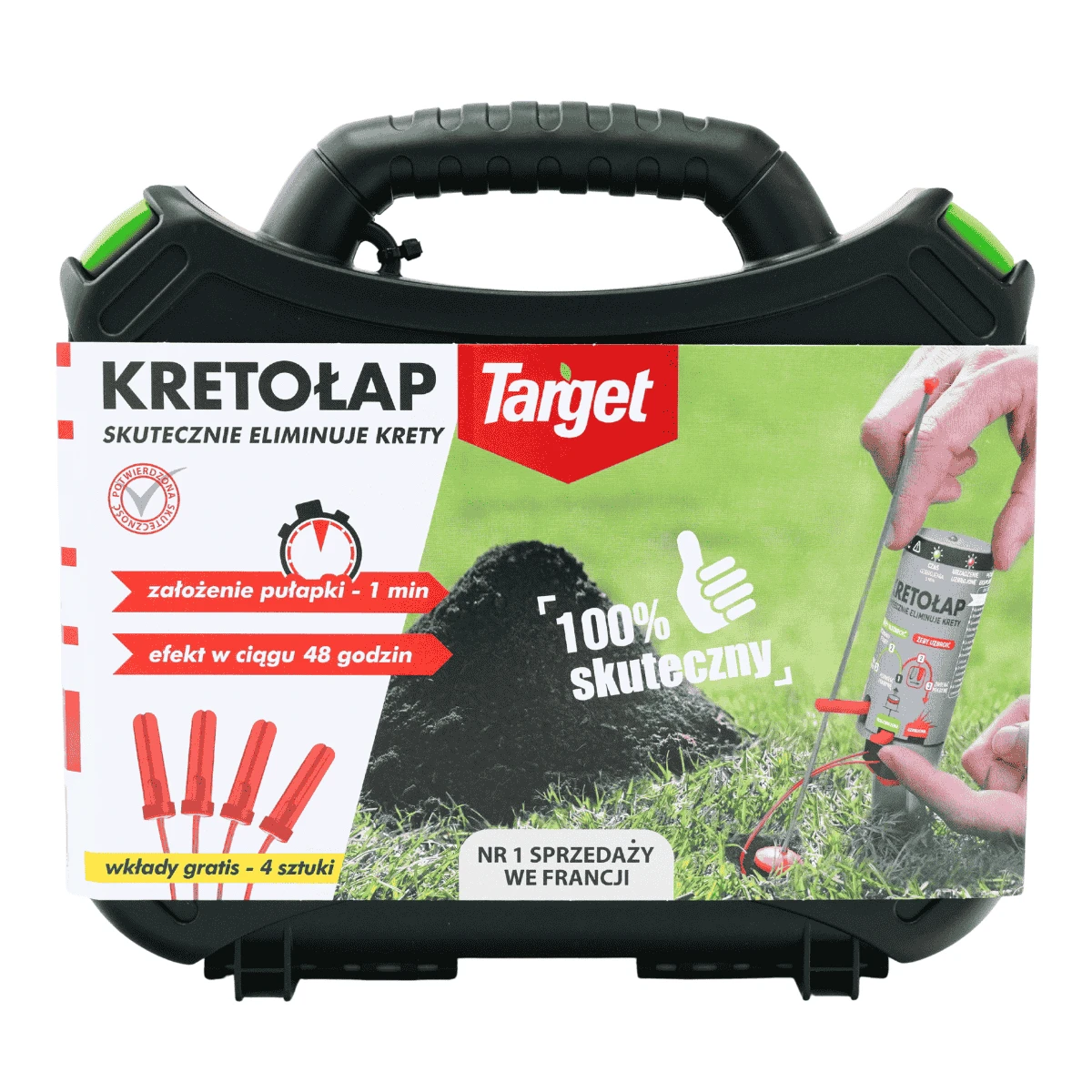 Target Kretołap to praktyczne rozwiązanie przeznaczone do zwalczania kretów na terenach zielonych. Działanie urządzenia opiera się na naturalnym zachowaniu zwierząt, polegającym na regularnym powracaniu do wcześniej wykonanych korytarzy i kopców. Po prawidłowym zamontowaniu pułapka uruchamia mechanizm eliminujący szkodnika w momencie, gdy ten próbuje ponownie zatkać otwór w kretowisku.