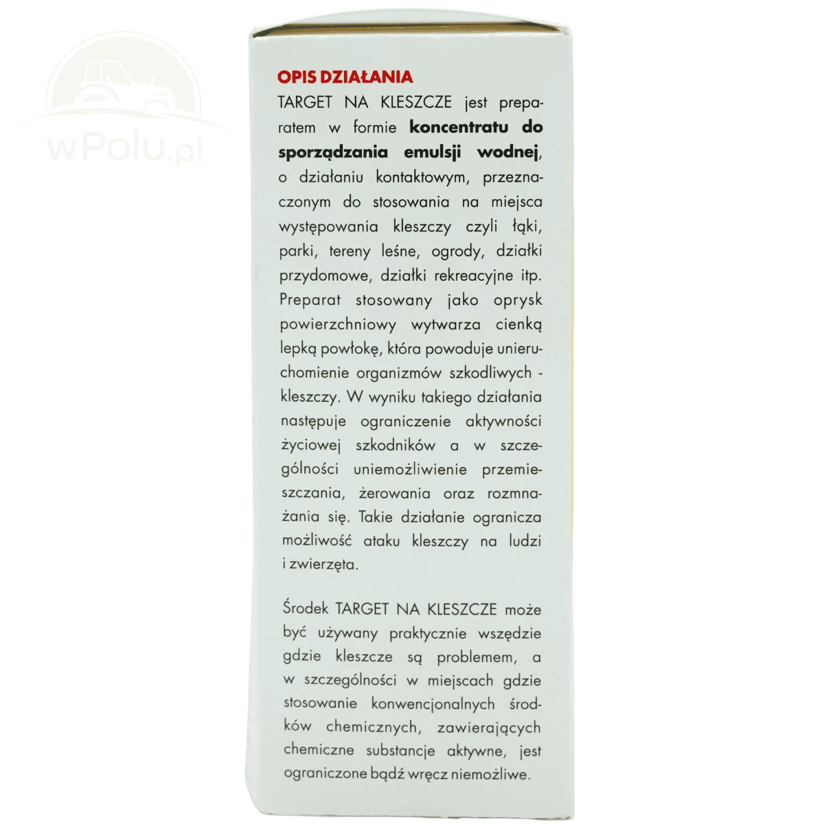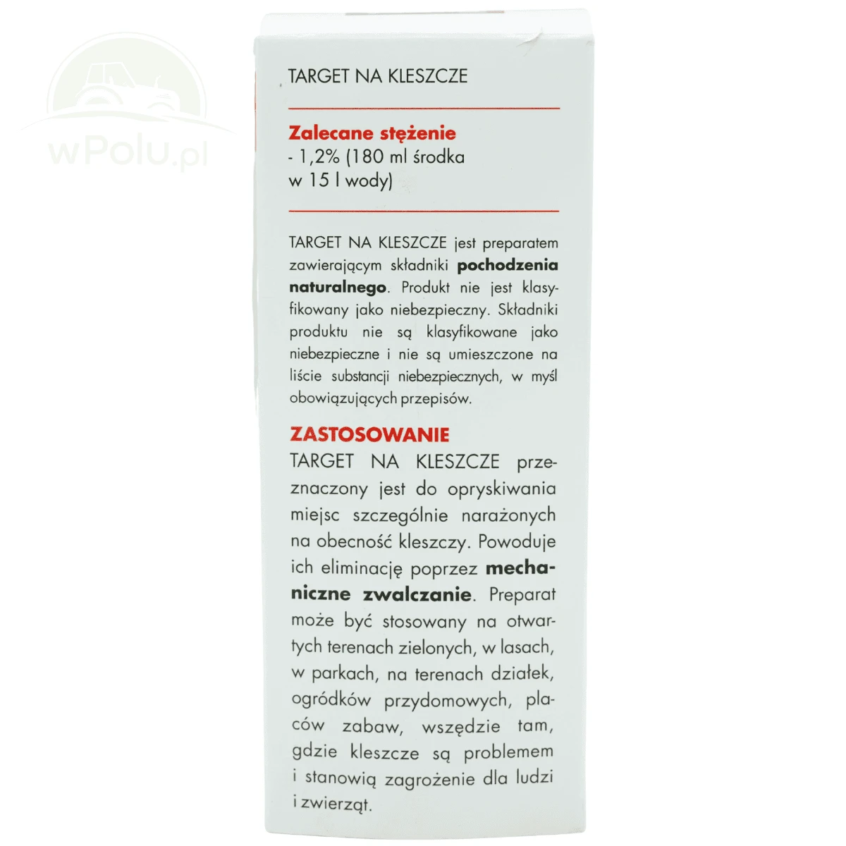jest preparatem o szerokim spektrum działania. Skutecznie ogranicza aktywność różnych gatunków roztoczy, dlatego może być z powodzeniem stosowany do eliminacji szkodliwych kleszczy. TARGET NA KLESZCZE można stosować przy użyciu opryskiwaczy ciśnieniowych dających oprysk średnio lub grubokroplisty. Mogą to być zarówno małe, ręczne opryskiwacze, jak i duże opryskiwacze przeznaczone do opryskiwania dużych powierzchni, np. w zabiegach przeprowadzanych na terenach leśnych. Potrzebną ilość cieczy użytkowej należy dobrać tak aby cały teren, na którym występują kleszcze został dokładnie nią pokryty. Opryskiwać należy trawę, zarośla drzewa i krzewy, miejsca zacienione, jak i nasłonecznione. Szczególną uwagę należy zwrócić na dokładne pokrycie miejsc na których kleszcze najchętniej przesiadują oczekując na możliwość przejścia na człowieka lub zwierzę - końcówki liści traw, drzew i krzewów. Zabiegi preparatem TARGET NA KLESZCZE można powtarzać, a szczególnie wskazane jest tam, gdzie nasilenie występowania kleszczy jest duże. Preparat może być stosowany od wczesnej wiosny, kiedy obserwuje się wzmożoną aktywność kleszczy, do późnej jesieni kiedy kleszcze szukają schronienia przed zimą w opadłych liściach i zaschniętej trawie.