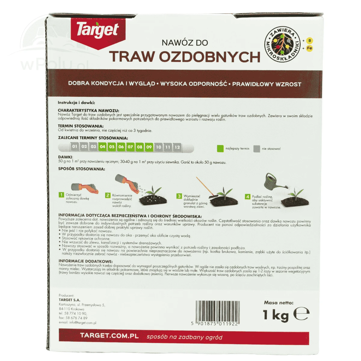 Opakowanie nawozu do Traw Ozdobnych Target o wadze 1 kg wystarcza na około 30 m² powierzchni.
