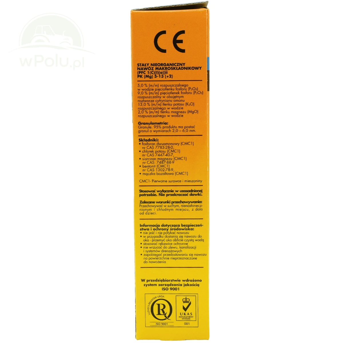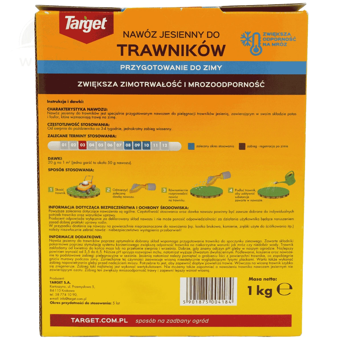 Nawóz jesienny do trawników jest to nawóz WE typu PK, zawierającym w swoim składzie takie składniki pokarmowe jak: fosfor, potas, wapń i siarkę. Odpowiednio dobrany skład nawozu przygotowuje trawę do przetrwania zimy. Wzmacnia system korzeniowy traw oraz powoduje intensywne krzewienie się trawy na wiosnę.