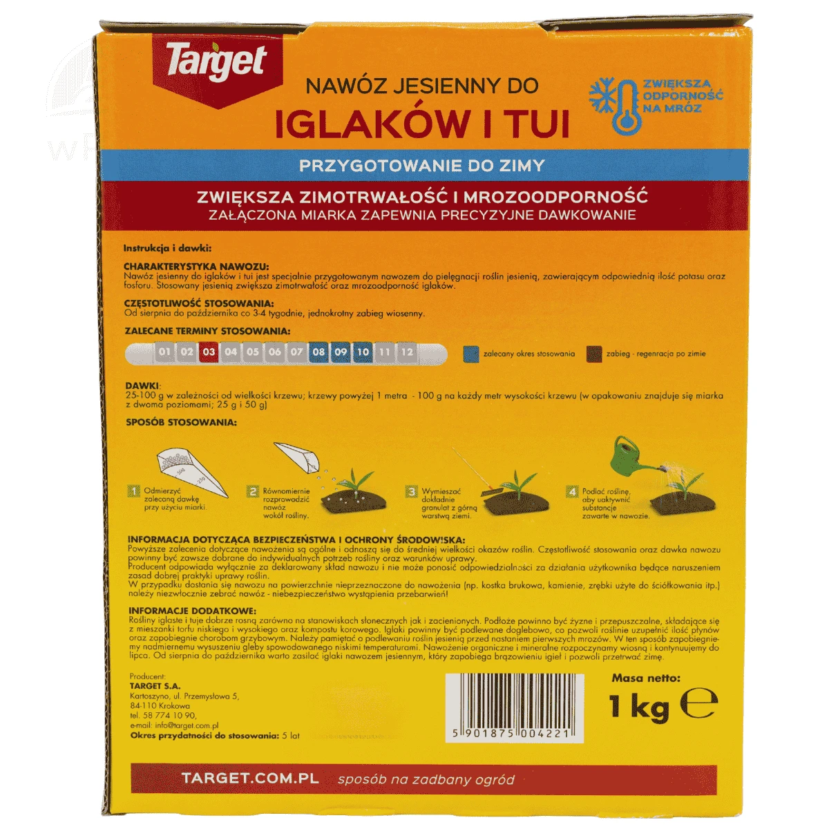 Nawóz jesienny do iglaków i tui stosuje się w okresie jesiennym, aby wzmocnić rośliny przed zimą i zwiększyć ich odporność na mróz. Można go także użyć wczesną wiosną, w marcu, jako zabieg regeneracyjny po zimie. Produkt idealnie sprawdza się do nawożenia tui, świerków, sosen, jałowców oraz innych gatunków iglastych uprawianych w ogrodach i na działkach.