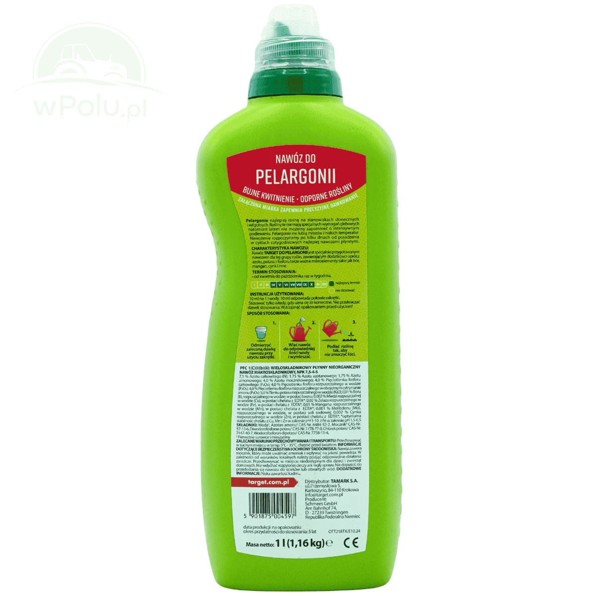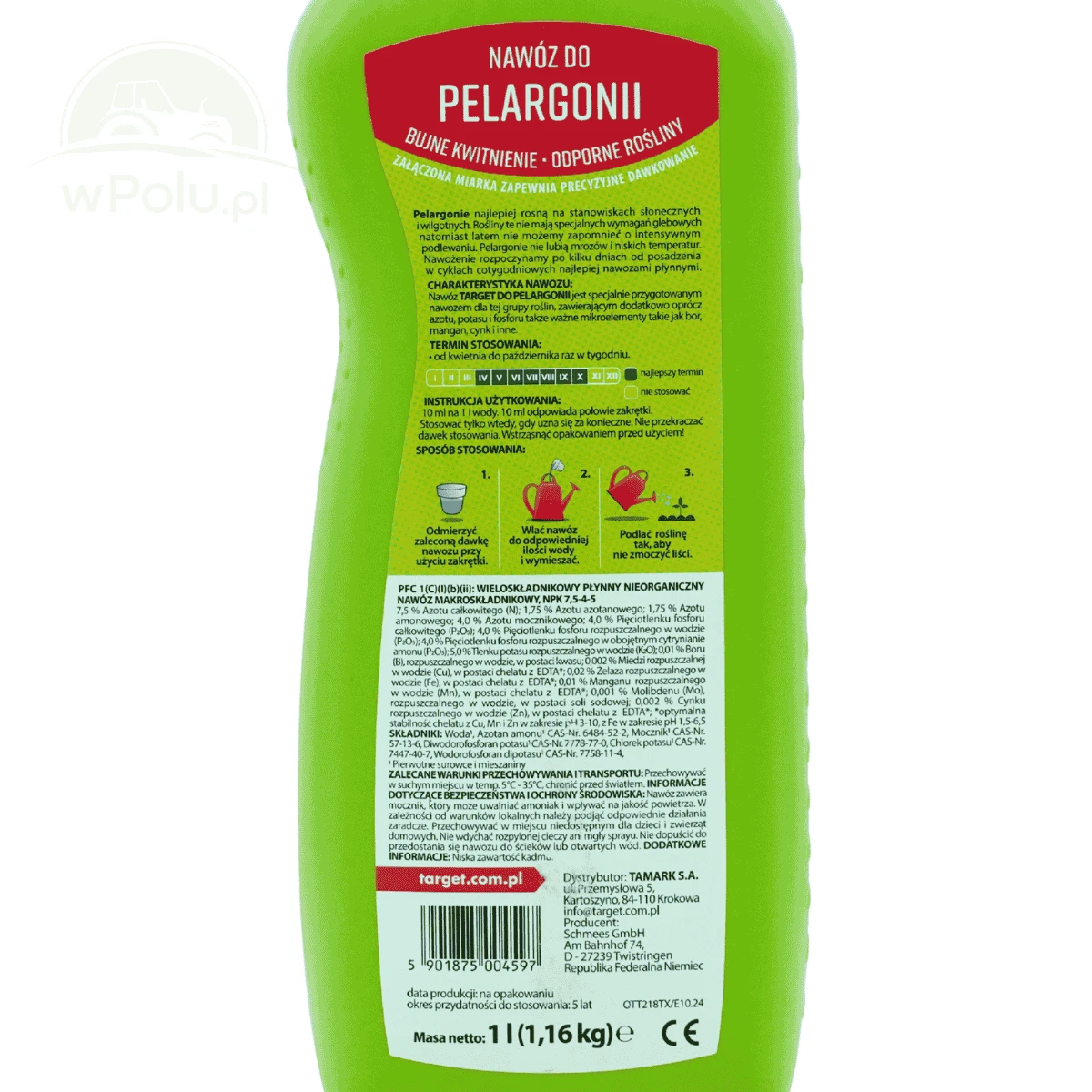 Nawóz do pelargonii zapewnia intensywne wybarwienie kwiatów oraz wydłuża okres kwitnienia wszystkich odmian pelargonii. Jest to nawóz WE typu NPK, który zawiera podstawowe składniki pokarmowe: azot, fosfor, potas oraz mikroskładniki takie jak: bor, miedź, żelazo, mangan, molibden i cynk.