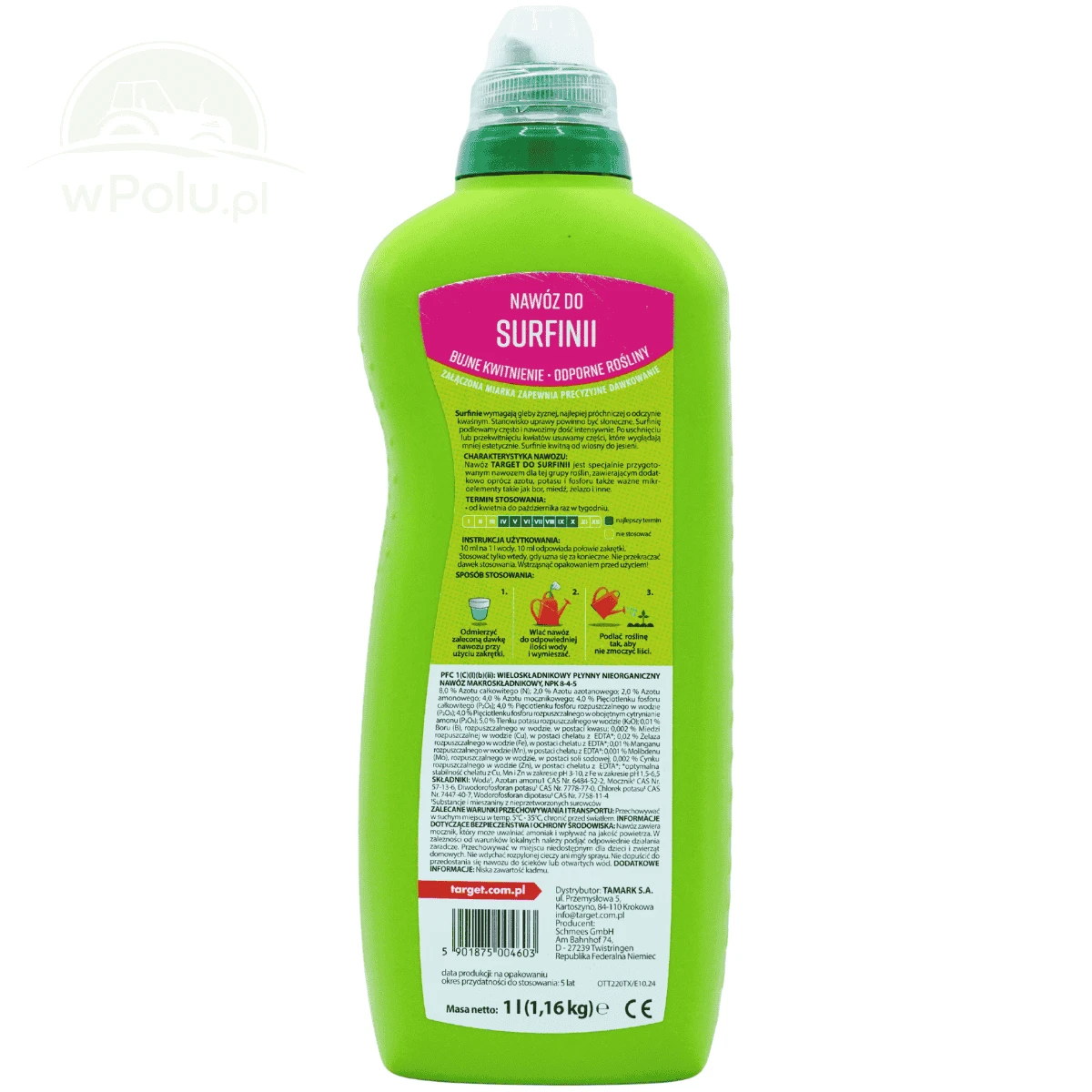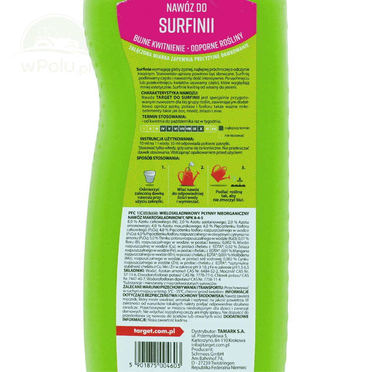 Nawóz płynny do surfinii Okazałe Kwiaty doskonale pobudza wzrost pąków kwiatowych i przedłuża okres ich kwitnienia. Jest nawozem WE typu NPK, który zawiera podstawowe składniki pokarmowe: azot, fosfor, potas oraz mikroskładniki takie jak: bor, miedź, żelazo, mangan, molibden i cynk. Produkt ma załączoną miarkę, która ułatwia jego dawkowanie.
