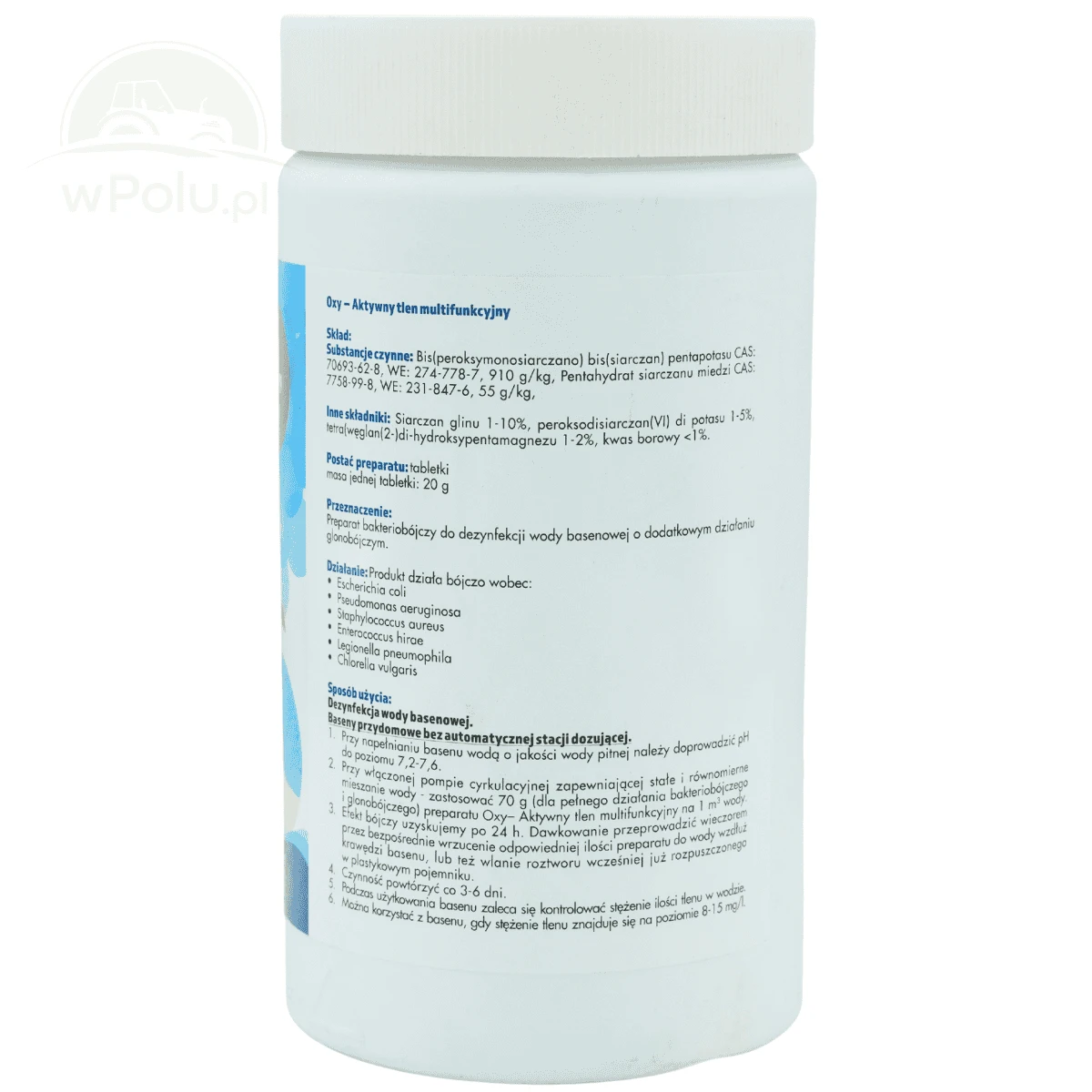 Oxy – Aktywny tlen to wielofunkcyjny preparat dezynfekujący przeznaczony do uzdatniania wody basenowej, stanowiący skuteczną alternatywę dla tradycyjnych środków chlorowych. Produkt występuje w postaci tabletek o masie 20 g, które zapewniają długotrwałe działanie bakteriobójcze oraz dodatkowe właściwości glonobójcze. Preparat przeznaczony jest do dezynfekcji wody w basenach przydomowych bez automatycznej stacji dozującej. Opakowanie zawiera tabletki w formie stałej, umożliwiające precyzyjne dawkowanie zgodnie z zaleceniami producenta.