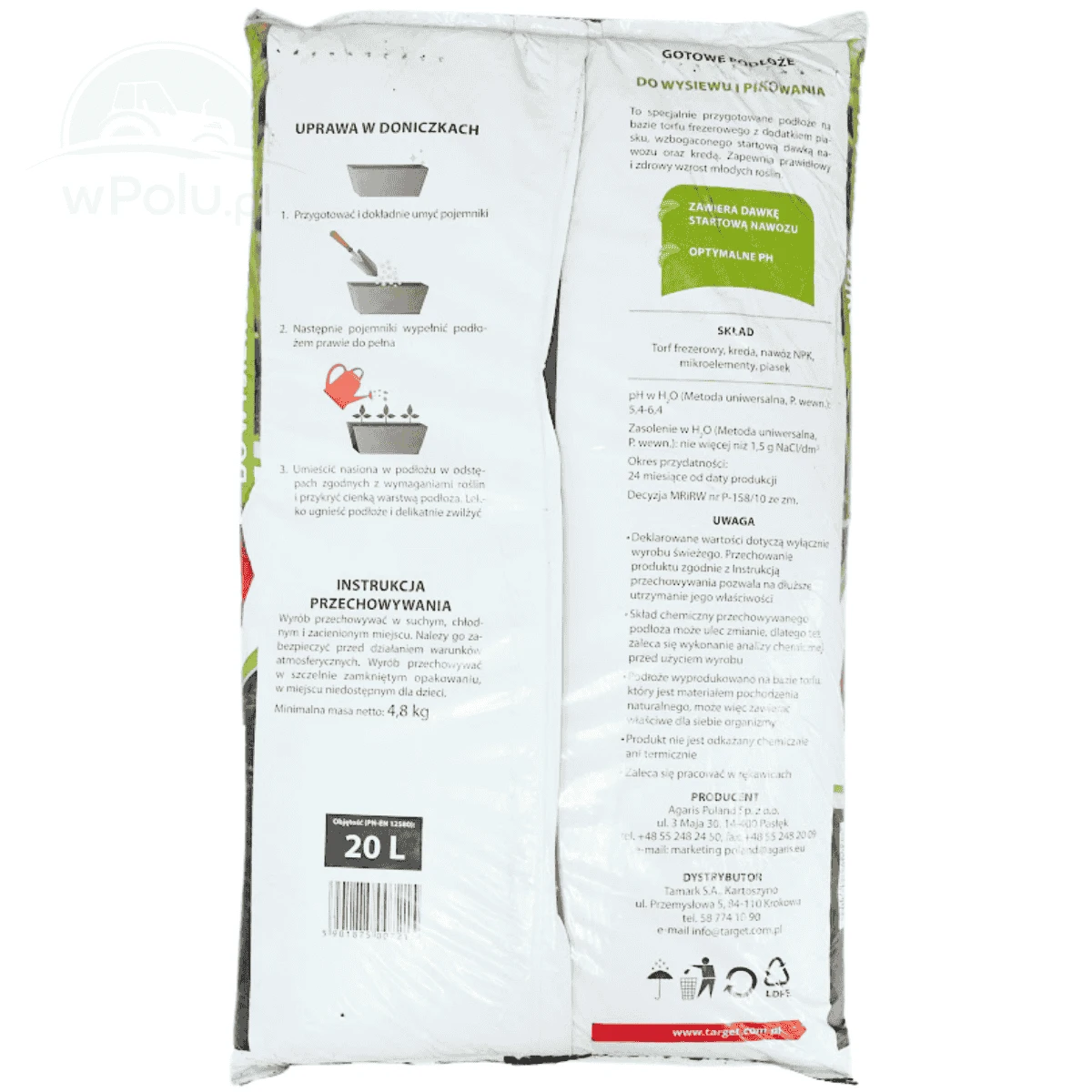 Specjalnie przygotowana ziemia składająca się z torfu niskiego przesianego i wysokiego przesianego w odpowiednich proporcjach, przeznaczona do siewu. Optymalne pH zapewnia prawidłowy wzrost młodych siewek. Podłoże ułatwia pobieranie wody i składników pokarmowych. Dodatkowo zawiera także dawkę startową nawozu oraz mączkę dolomitową. Zapewnia prawidłowy i zdrowy wzrost młodych roślin.