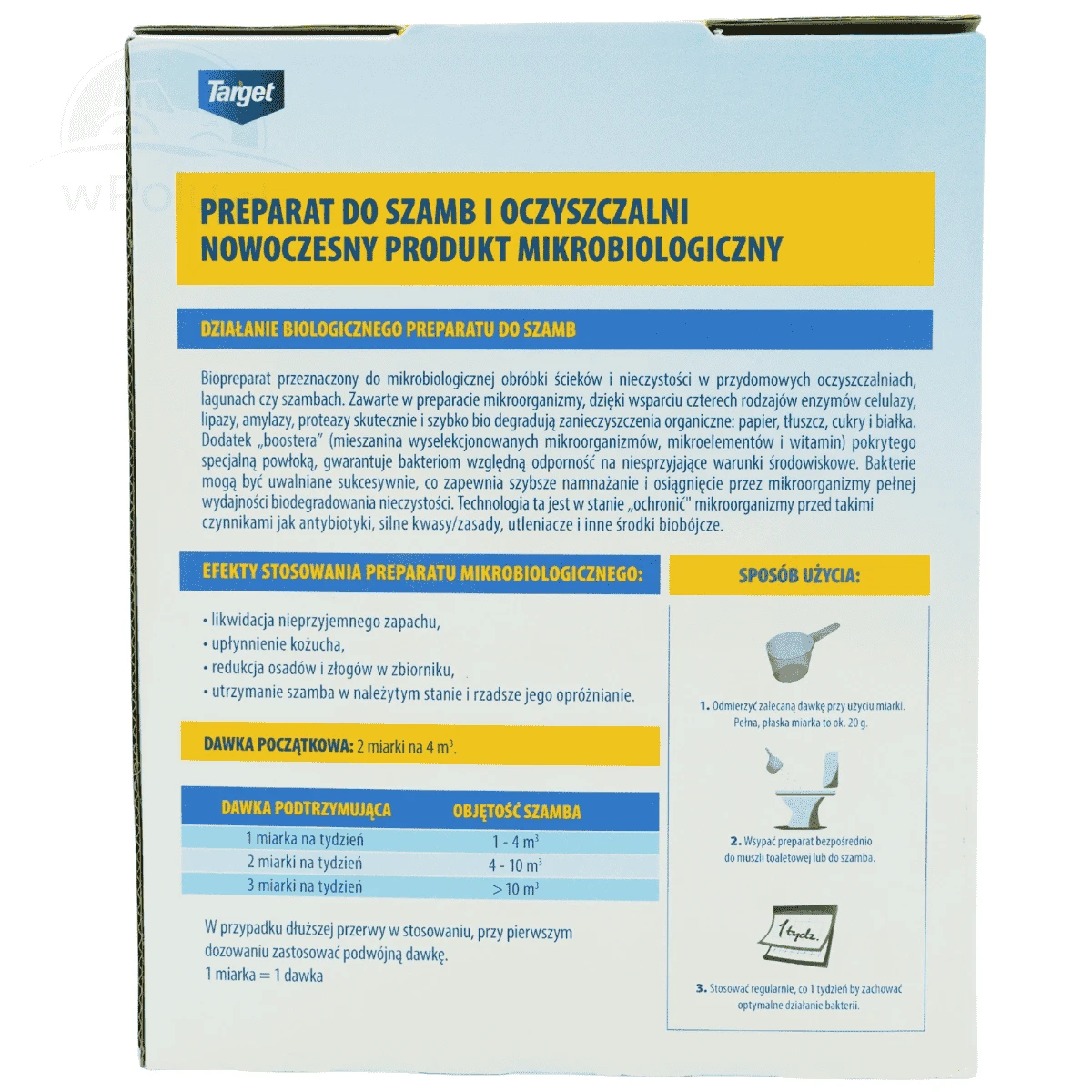 Preparat przeznaczony do biodegradacji zawartości domowych szamb i oczyszczalni.