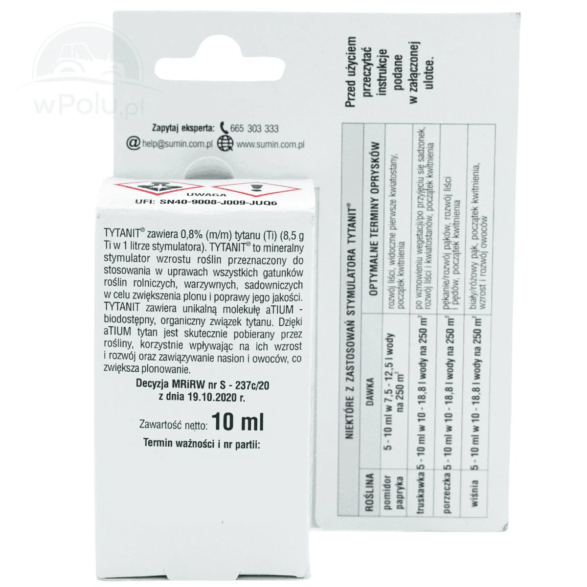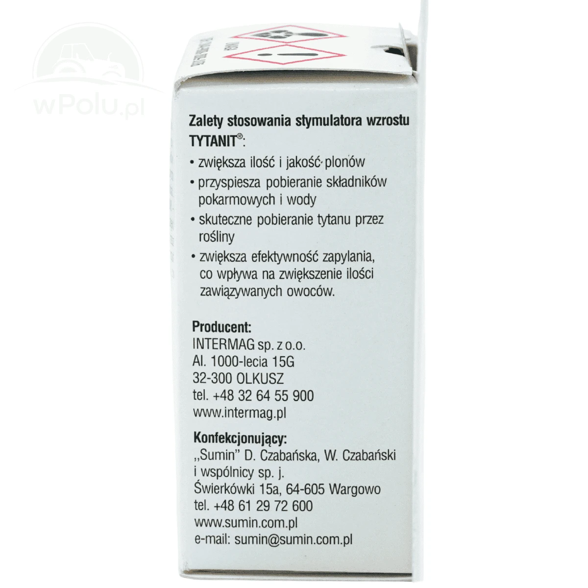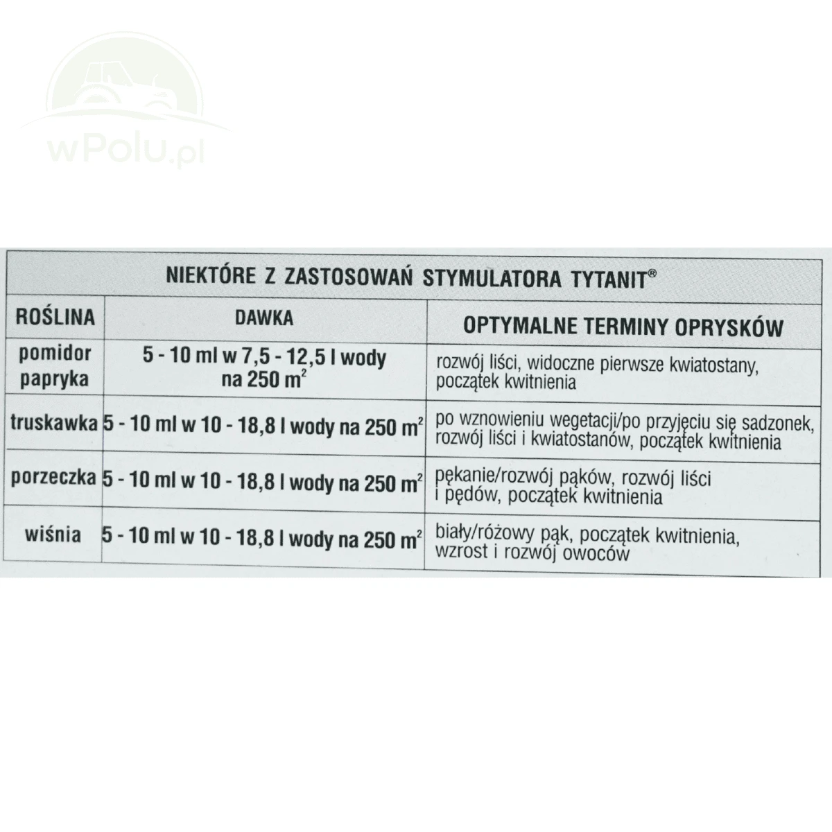 Stymulator wzrostu wpływający na poprawę zawiązywania owoców pomidora, papryki, wiśni, porzeczki i truskawki. Poprawia jakość pyłku kwiatowego, stymuluje procesy zapylenia i zapłodnienia, a także sprzyja prawidłowemu rozwojowi zawiązków, dzięki czemu podnosi plonowanie roślin i przyspiesza zbiory. Wpływa też jakość plonów. Tytanit wzmacnia system odpornościowy roślin na choroby i szkodniki oraz stymuluje wszystkie procesy biochemiczne, w tym fotosyntezę, oddychanie czy transpirację. Dodatkowo zwiększa odporność roślin na niekorzystne warunki atmosferyczne takie jak susza, nadmierna wilgoć i niskie lub zbyt wysokie temperatury. Powoduje szybszy rozwój części nadziemnych i podziemnych roślin.