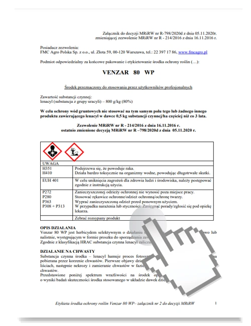 Pełne stosowanie znajdziesz w etykiecie środka ochrony roślin Venzar 80 WP poniżej.