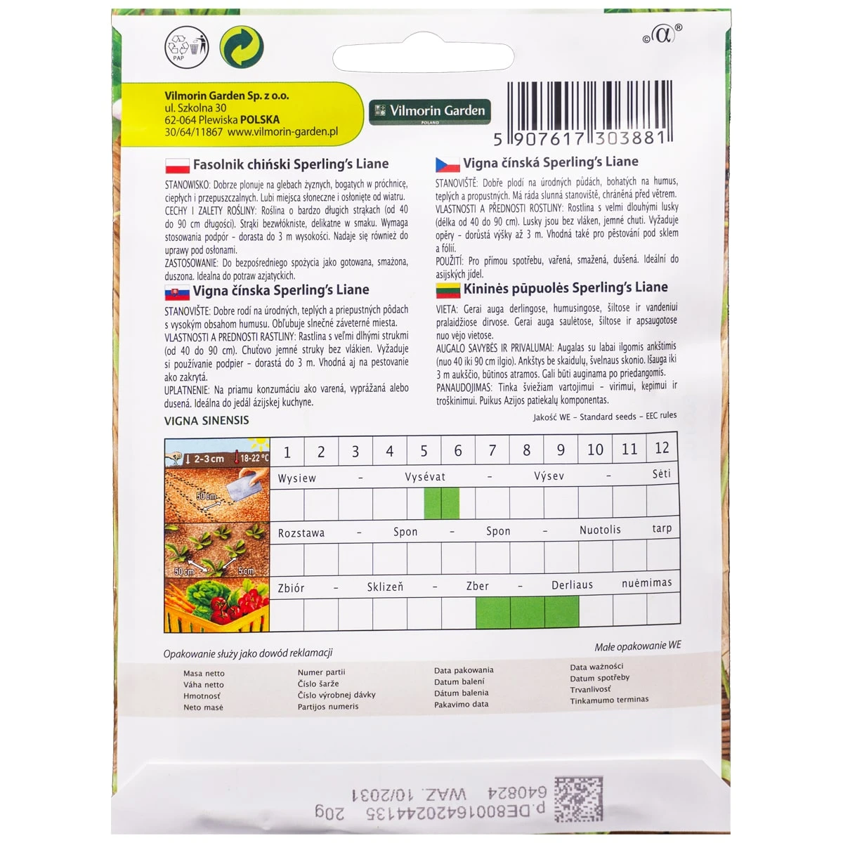 Fasolnik chiński Sperling's Liane, znany także jako wspięga chińska to wyjątkowa roślina, która może być uprawiana zarówno w gruncie, jak i pod osłonami. Tworzy niezwykle długie, cienkie, zielone strąki o długości od 40 do nawet 90 cm. Są onei są delikatne, słodkie w smaku i pozbawione włókien, co czyni je znakomitą alternatywą dla tradycyjnej fasolki szparagowej. Strąki najlepiej zbierać, gdy są jeszcze niedojrzałe, a następnie spożywać po ugotowaniu lub usmażeniu w całości. Doskonale sprawdzają się również w przetworach – można je konserwować lub mrozić. Fasolnik dorasta do wysokości 3 metrów, dlatego wymaga stosowania podpór. Roślina ma dość duże wymagania cieplne, dlatego najlepiej sadzić ją w miejscach osłoniętych od wiatru lub pod osłonami.