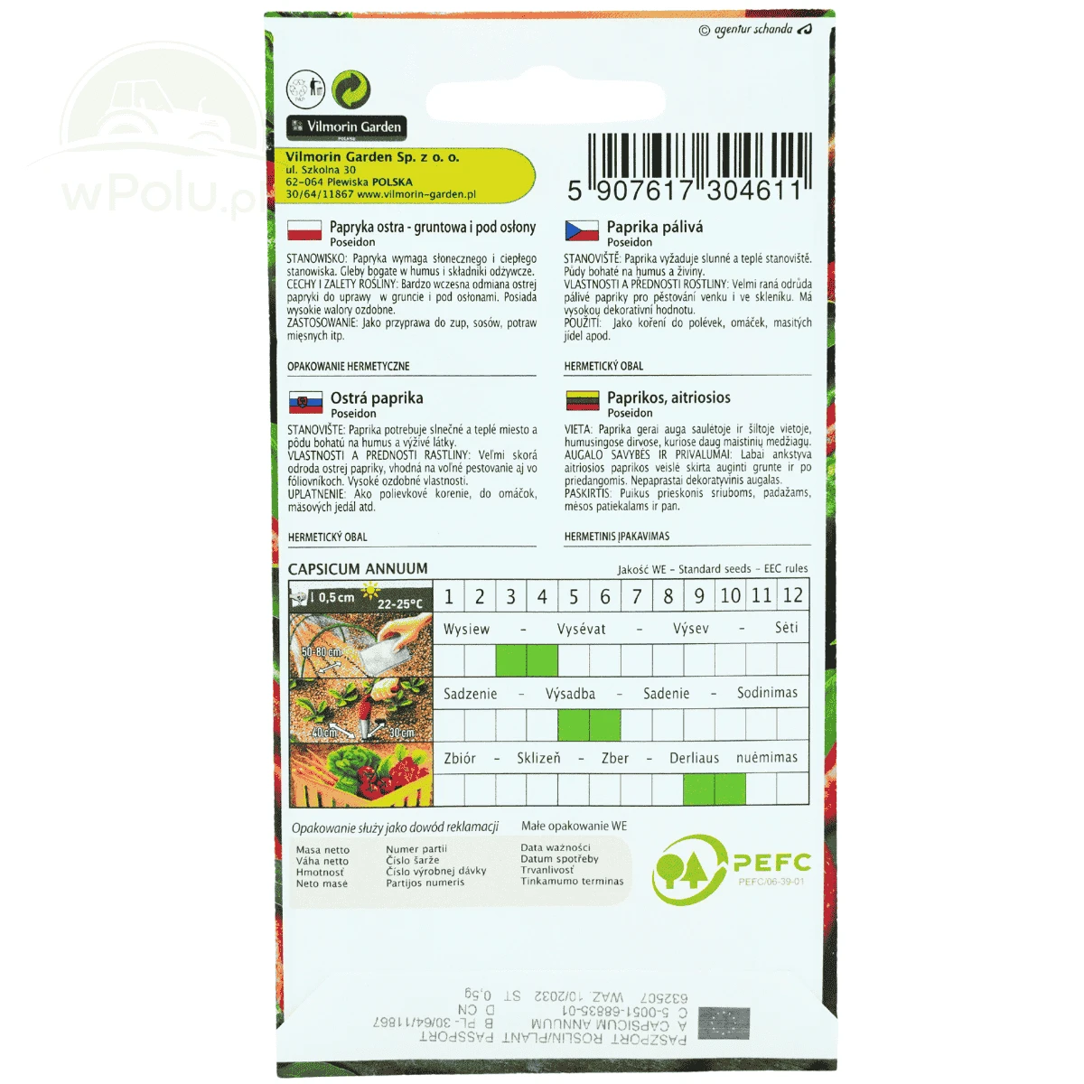 Papryka ostra Poseidon to wczesna odmiana papryki ostrej przeznaczona do uprawy zarówno w gruncie, jak i pod osłonami. Należy do gatunku Capsicum annuum i wyróżnia się intensywnym wzrostem oraz wysoką wartością dekoracyjną. Rośliny tworzą liczne, smukłe i wydłużone owoce o charakterystycznym, ostrym smaku. Na zdjęciu widoczne są papryki w barwie czerwonej oraz zielonej, co wskazuje na różne fazy dojrzałości owoców. Opakowanie ma klasyczną formę papierowej saszetki producenta Vilmorin, z wyraźnym oznaczeniem odmiany.