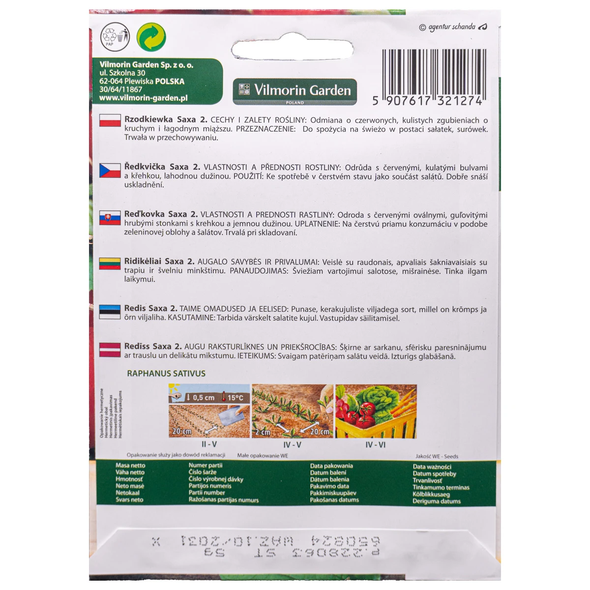 Rzodkiewka Saxa to odmiana o kulistych, czerwonych zgrubieniach z kruchym i łagodnym miąższem, doskonała do uprawy w gruncie oraz tunelach foliowych. Świetnie sprawdzi się jako dodatek do sałatek, kanapek i surówek. Wysiew bezpośrednio do gruntu od lutego do maja, zachowując rozstaw 2 × 20 cm. Zalecany siew punktowy w rozstawie 10 × 2,5 cm. Rzodkiewka najlepiej rośnie w warunkach krótkiego dnia, dlatego jej uprawę zaleca się wiosną i jesienią. Długi dzień oraz wysoka temperatura sprzyjają przedwczesnemu wybijaniu w pędy kwiatowe i powodują parcenie zgrubień. Roślina wymaga lekkiego, próchniczego i przepuszczalnego podłoża. Aby wytworzyć dorodne zgrubienia, potrzebuje dobrego dostępu do światła, dlatego nie należy jej uprawiać w miejscach zacienionych.