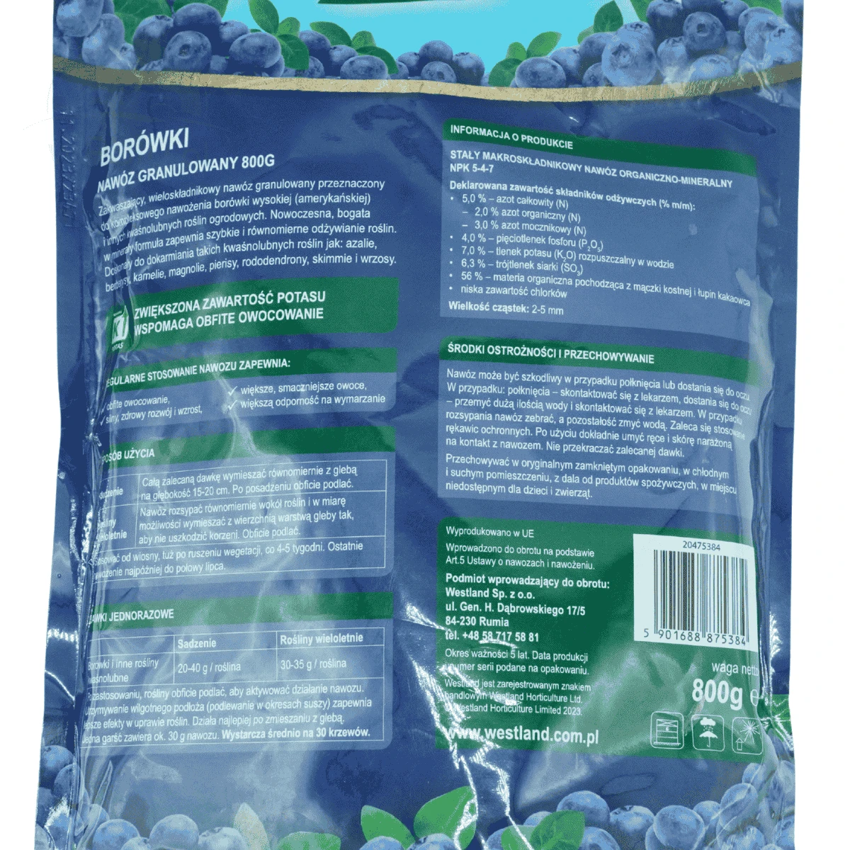 Nawóz do borówek Westland to zakwaszający, wieloskładnikowy granulat przeznaczony do kompleksowego nawożenia borówki wysokiej oraz innych roślin kwaśnolubnych. Organiczno-mineralna formuła NPK 5-4-7 wzbogacona w siarkę wspiera utrzymanie kwaśnego pH podłoża, a wysoka zawartość materii organicznej (z mączki kostnej i łupin kakaowca) poprawia strukturę gleby i aktywność mikrobiologiczną. Produkt pakowany jest w poręczne, stojące opakowanie 800 g, co ułatwia dozowanie i przechowywanie.