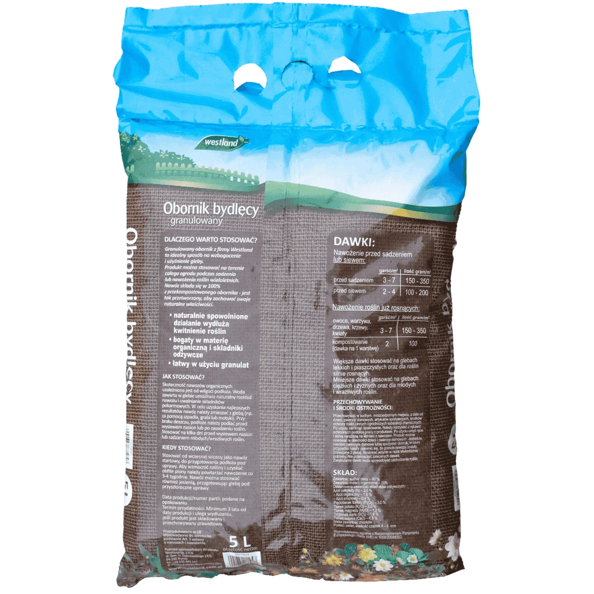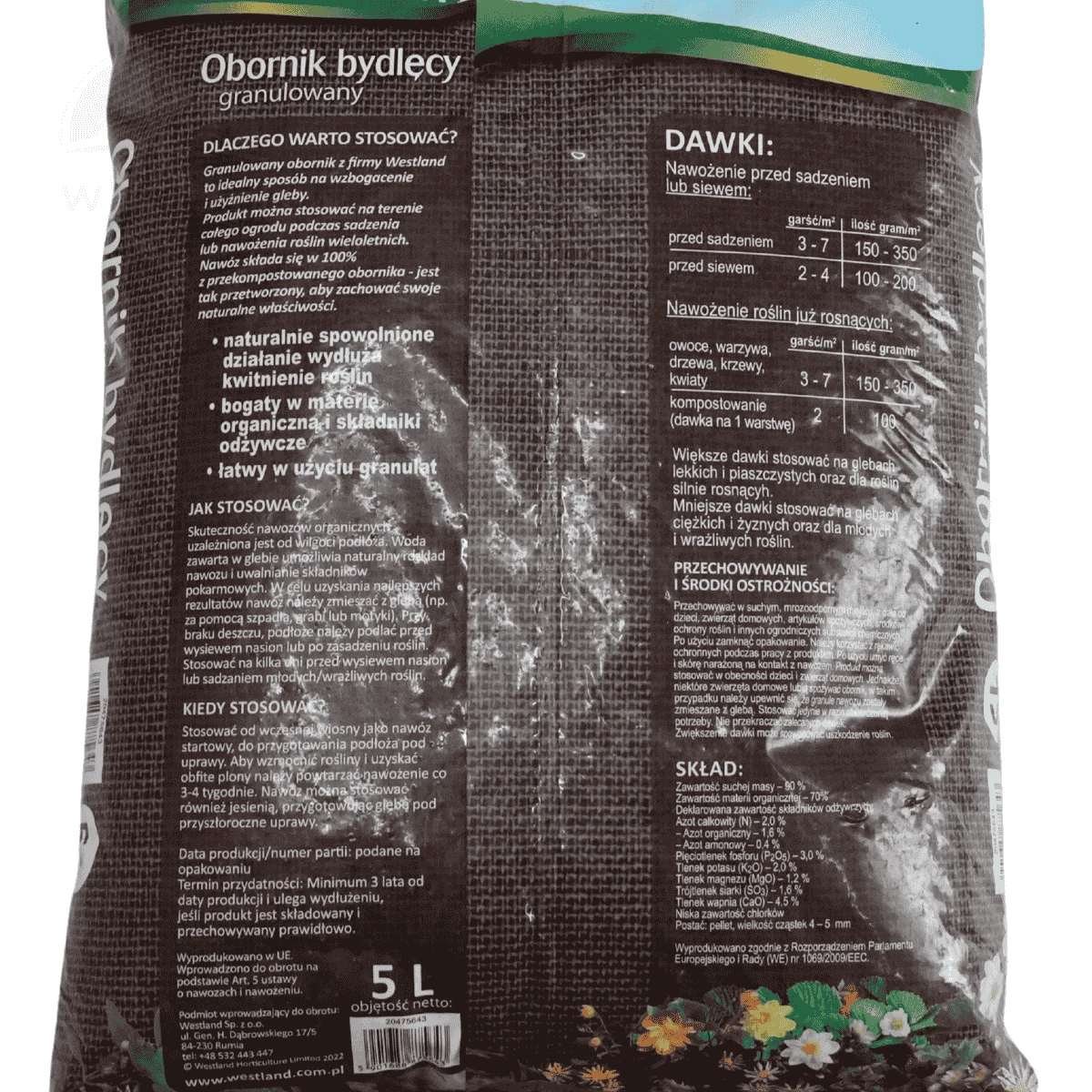 Obornik bydlęcy granulowany marki Westland to 100% naturalny nawóz organiczny, który skutecznie wzbogaca glebę, dostarczając niezbędnych składników odżywczych roślinom warzywnym, owocowym i ozdobnym. Dzięki powolnemu uwalnianiu składników pokarmowych wspiera długotrwały wzrost i obfite plonowanie.