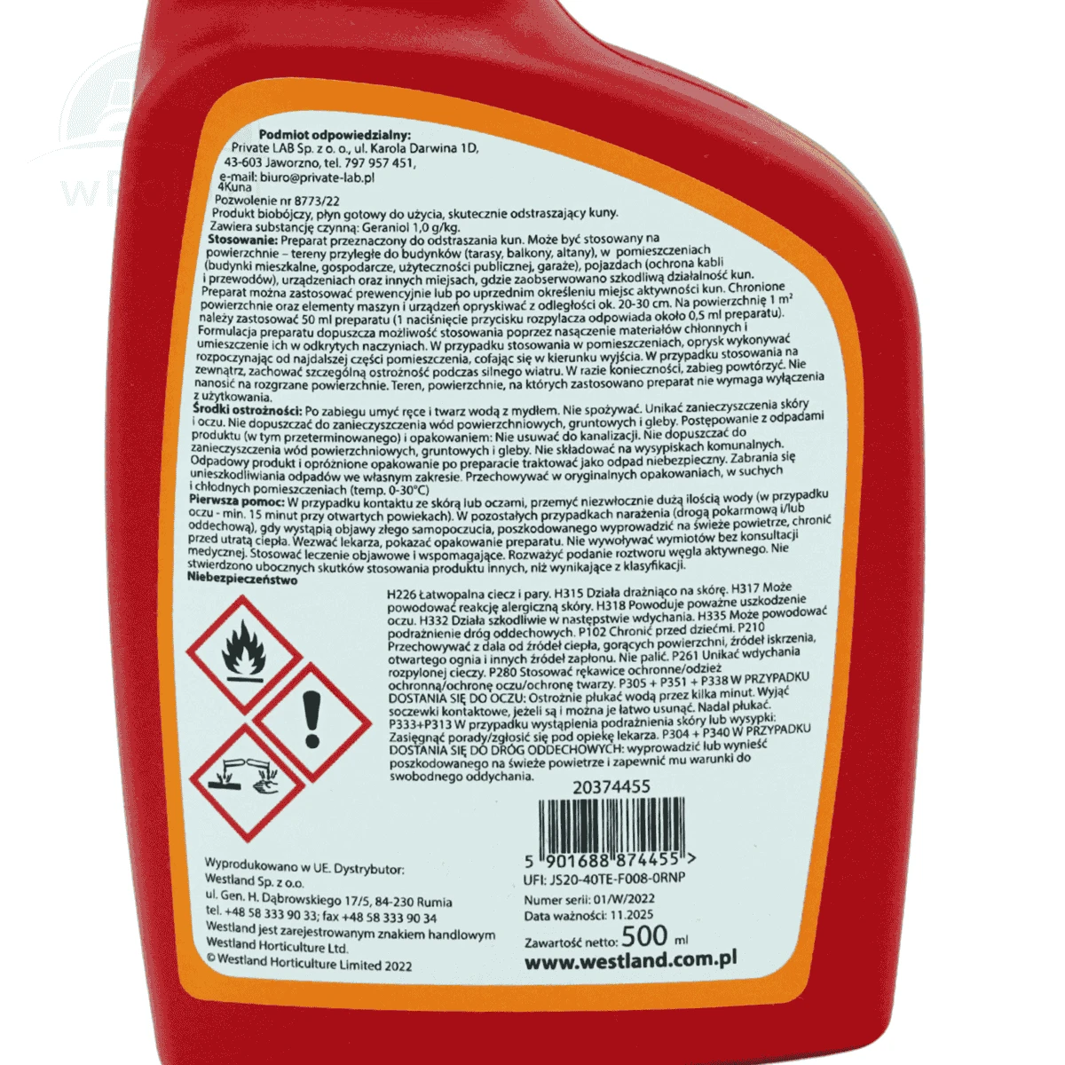 Środek przeznaczony do ochrony przed kunami, które mogą powodować uszkodzenia przewodów elektrycznych, kabli i elementów infrastruktury. Skutecznie zabezpiecza dom, garaż, altany, pojazdy oraz pomieszczenia gospodarcze przed szkodliwą działalnością tych zwierząt. Preparat można stosować zarówno prewencyjnie, jak i po wykryciu aktywności kun w danym miejscu.
