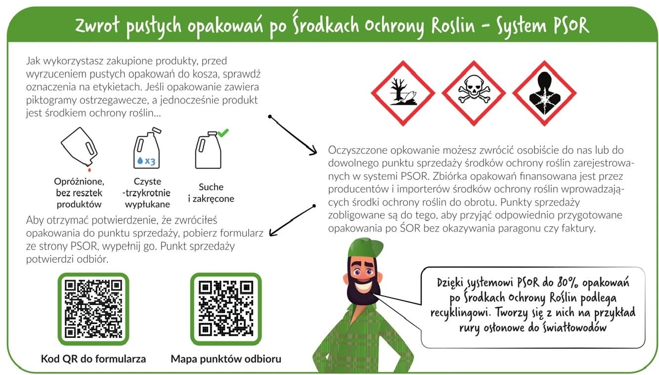 Niewłaściwe obchodzenie się z pustymi opakowaniami po środkach ochrony roślin stwarza zagrożenie dla zdrowia ludzi, zwierząt oraz środowiska. Dlatego należy bezwzględnie przestrzegać zasad ich przechowywania i przekazywania do utylizacji.