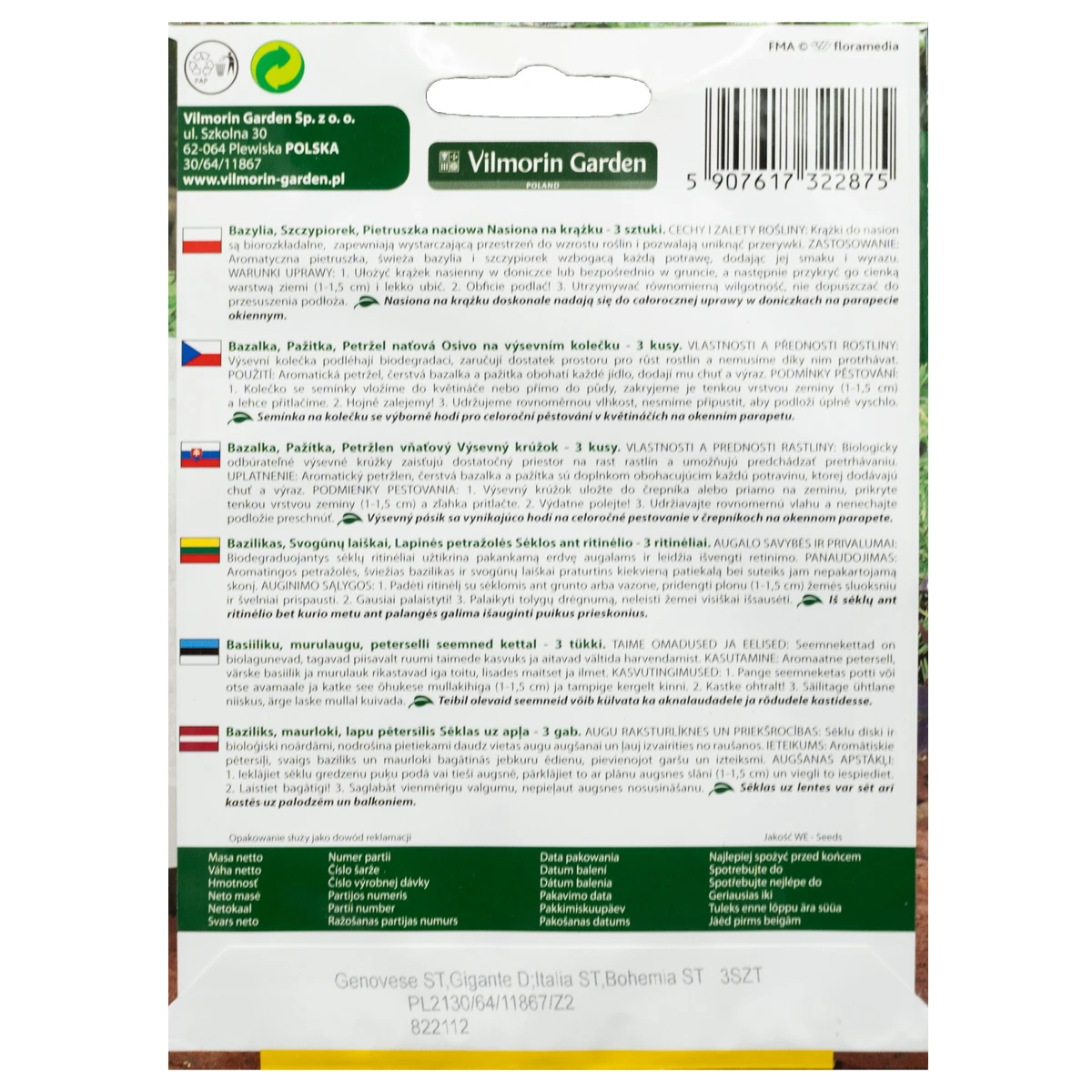 Opakowanie zawiera miszankę ziół takich jak: pietruszka, bazylia i szczypiorek. Nasiona ułożone są na krążku, który jest biodegradowalny. Krążek należy umieścić w doniczce lub bezpośrednio w gruncie, przykryć niewielką warstwą ziemi i podlać. Wilgotność utrzymywać na stałym poziomie. W opakowaniu znajdują się 3 krążki. Nasiona na krążku nadają się do całorocznej uprawy w doniczkach na parapecie.