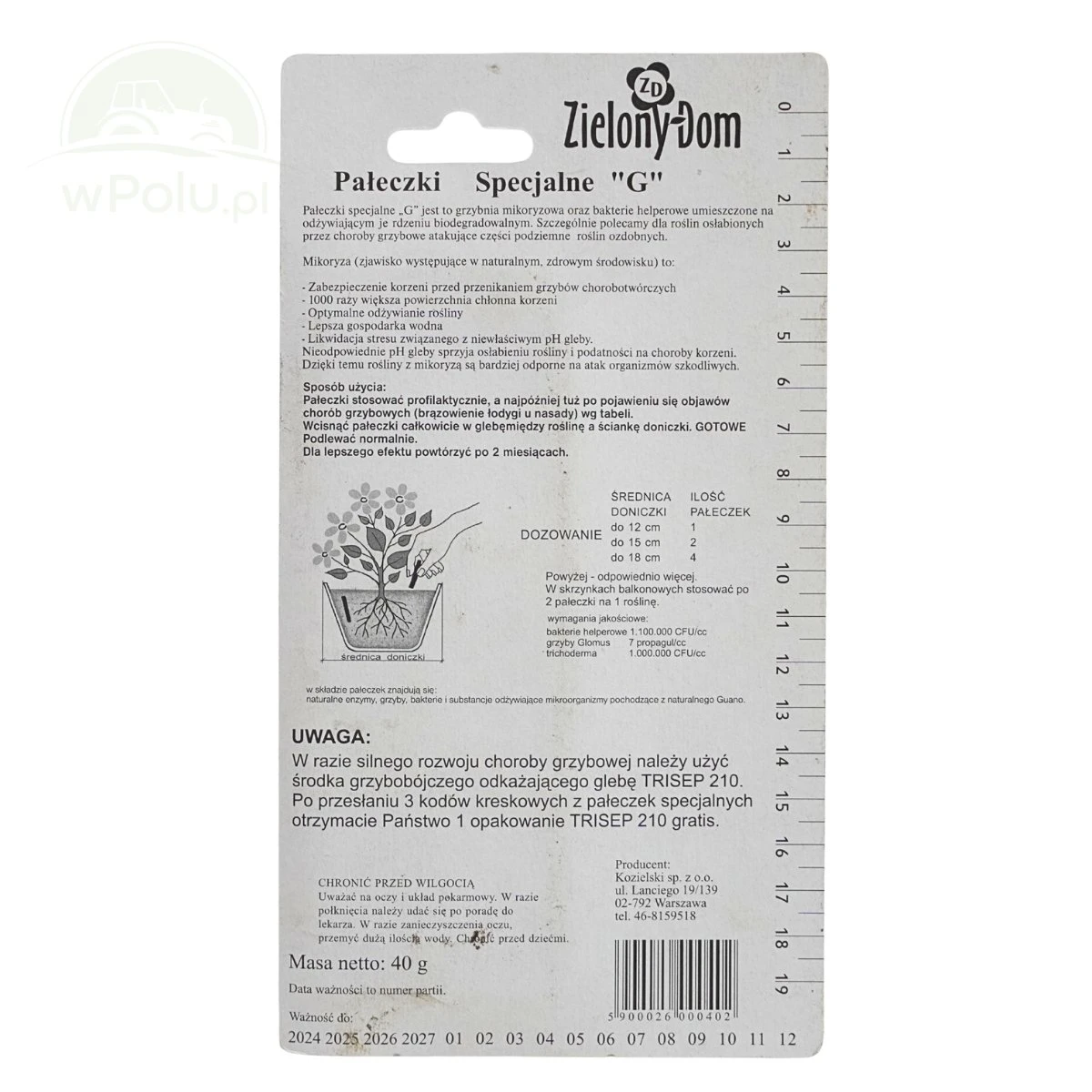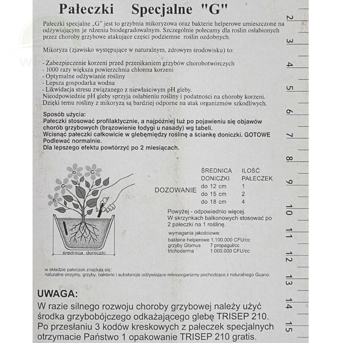 Pałeczki Specjalne "G" to produkt stworzony do wspierania roślin ozdobnych osłabionych przez choroby grzybowe atakujące części podziemne. Zawierają grzybnię mikoryzową oraz bakterie helperowe na biodegradowalnym rdzeniu, co sprzyja zwiększeniu odporności roślin na szkodniki i choroby.
